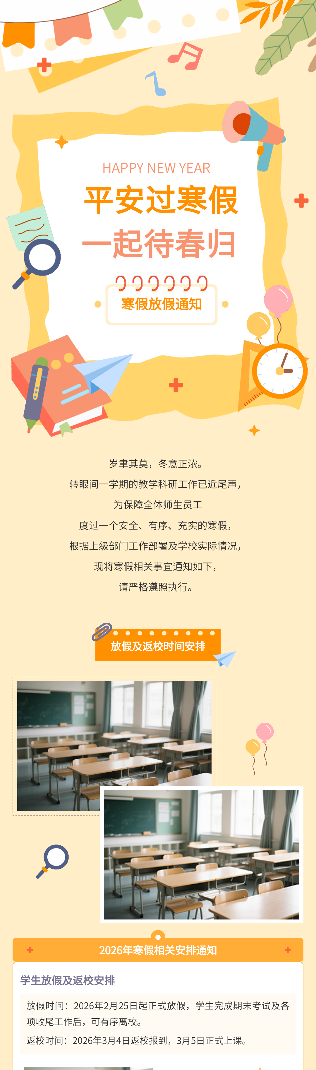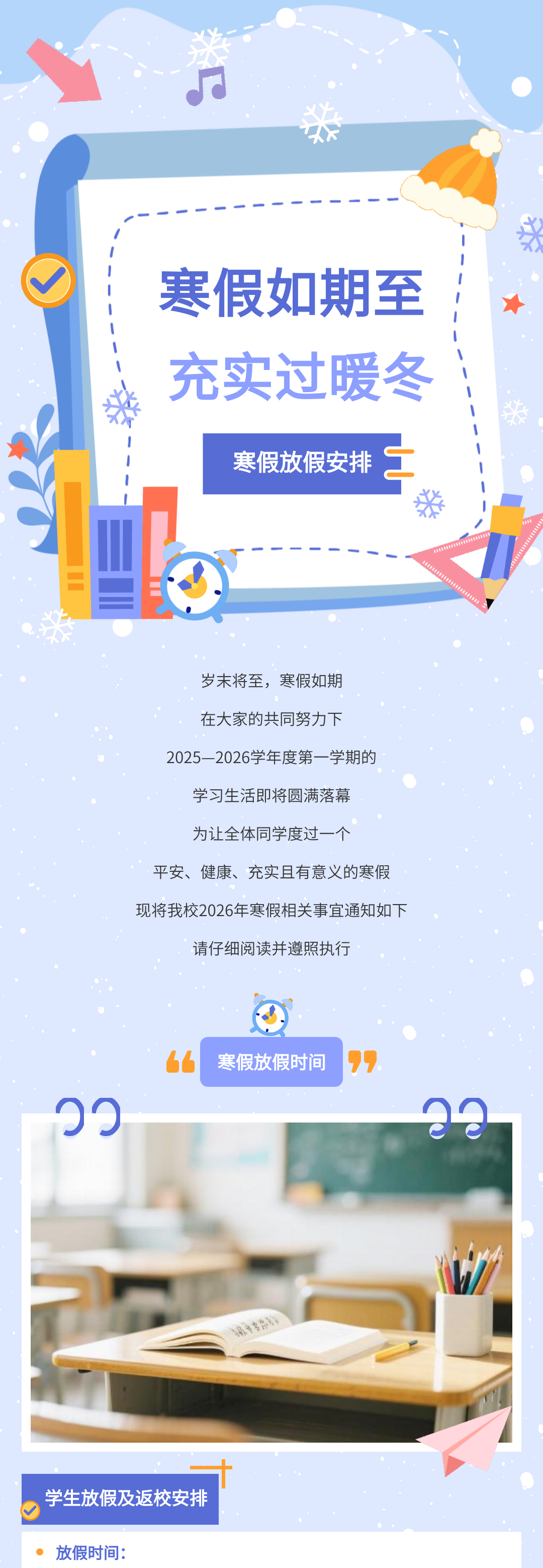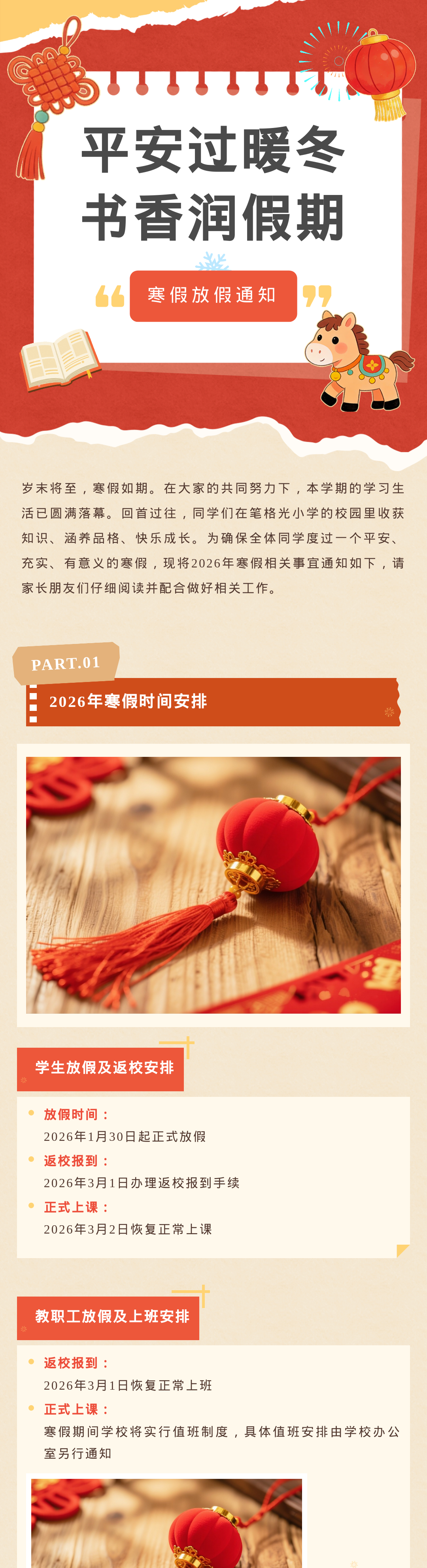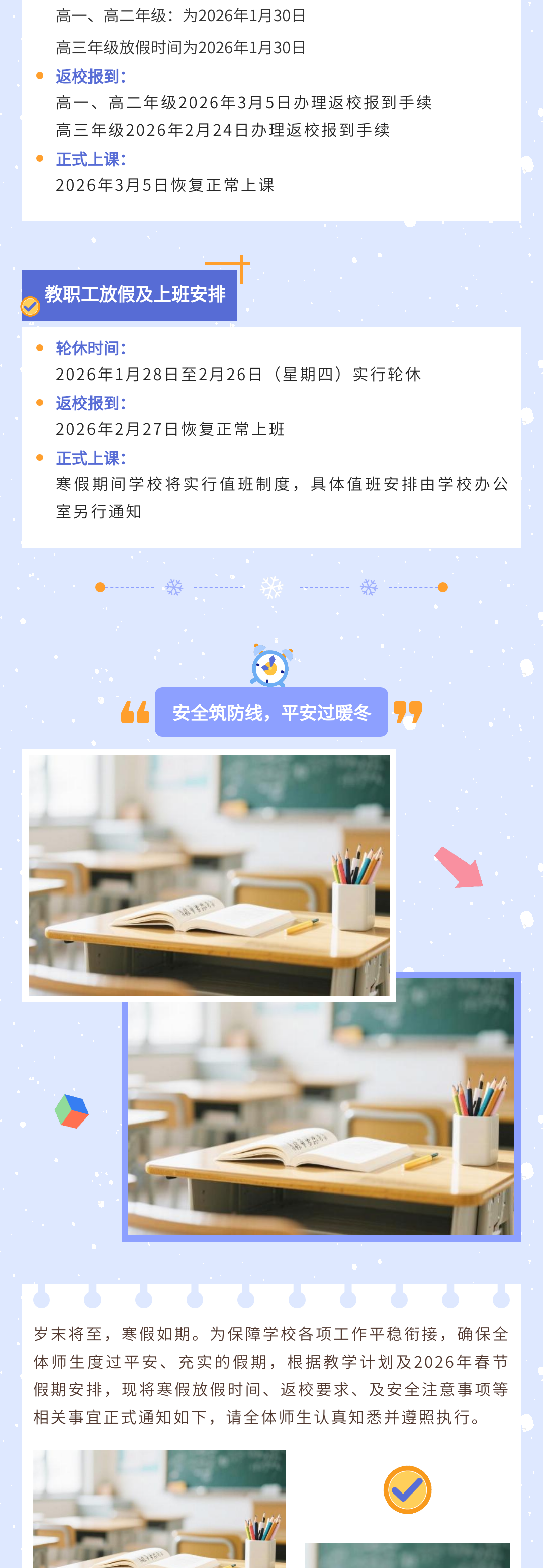 歲末將至,寒假如期。為保障學(xué)校各項(xiàng)工作平穩(wěn)銜接,確保全體師生度過平安、充實(shí)的假期,根據(jù)教學(xué)計劃及2026年春節(jié)假期安排,現(xiàn)將寒假放假時間、返校要求、及安全注意事項(xiàng)等相關(guān)事宜正式通知如下,請全體師生認(rèn)真知悉并遵照執(zhí)行。