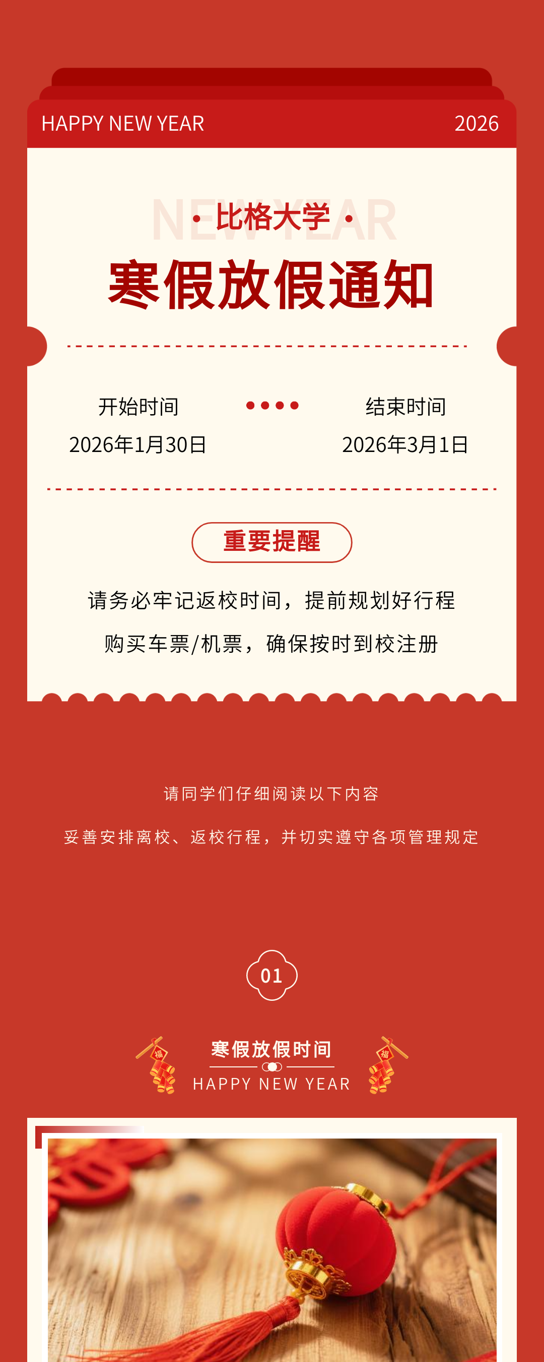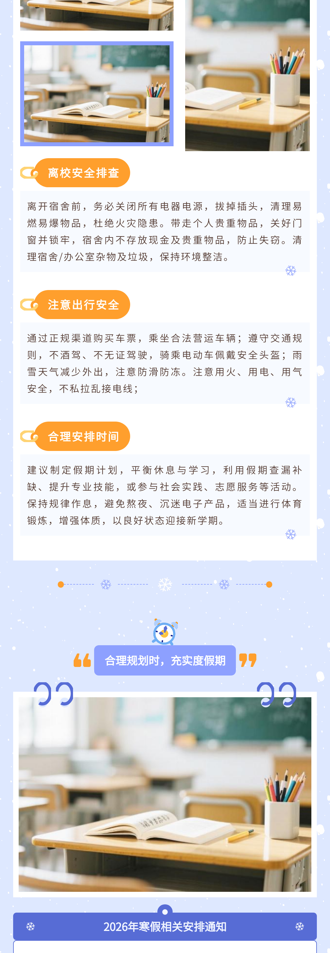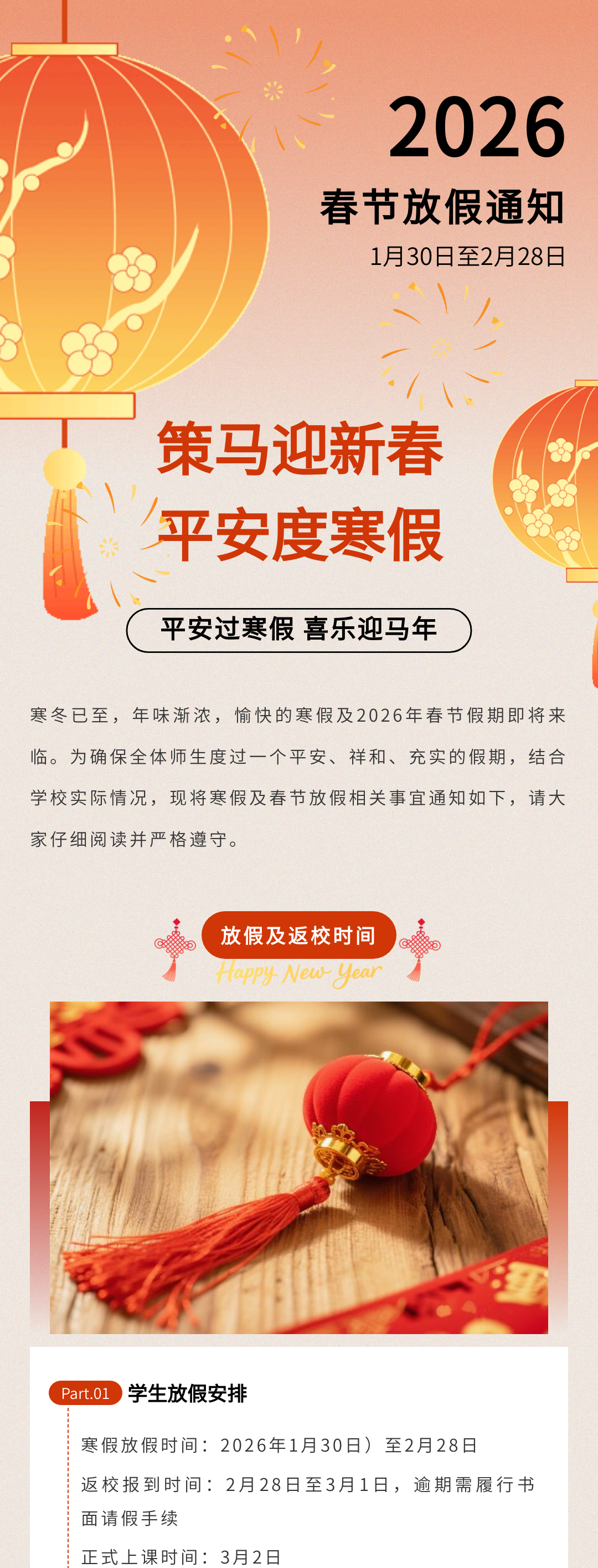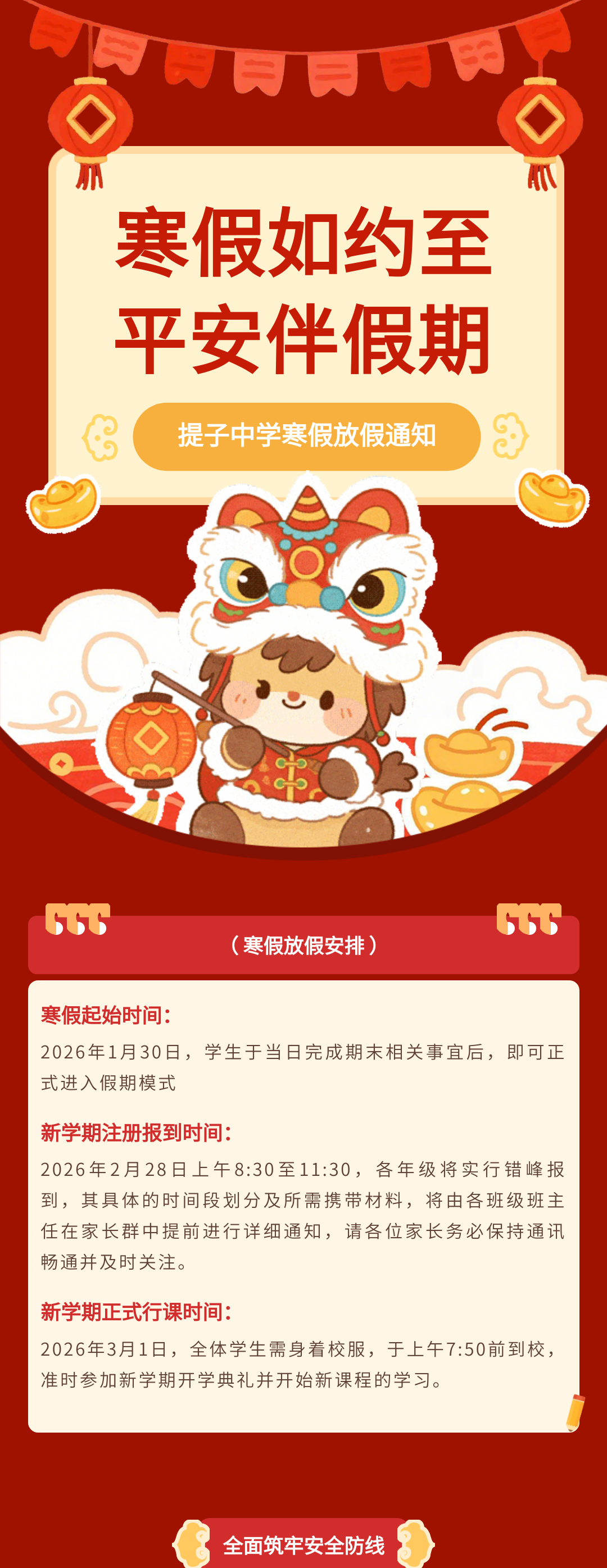 歲末將至,寒假如期。為保障學(xué)校各項(xiàng)工作平穩(wěn)銜接,確保全體師生度過平安、充實(shí)的假期,根據(jù)教學(xué)計劃及2026年春節(jié)假期安排,現(xiàn)將寒假放假時間、返校要求、及安全注意事項(xiàng)等相關(guān)事宜正式通知如下,請全體師生認(rèn)真知悉并遵照執(zhí)行。