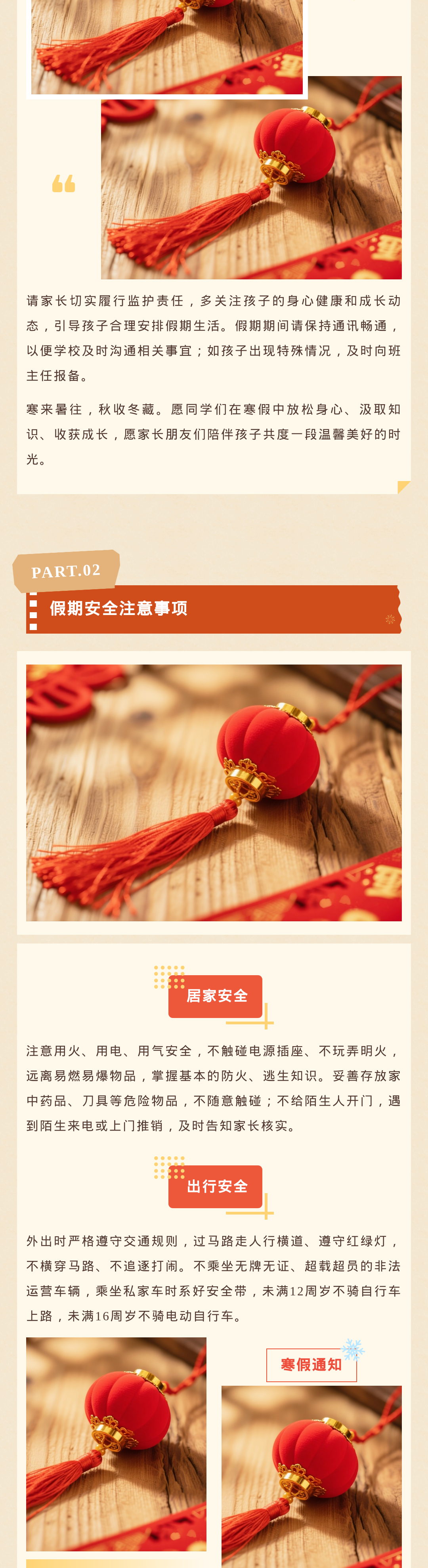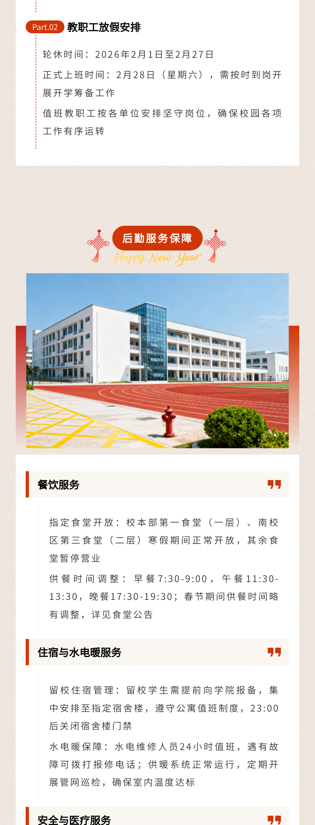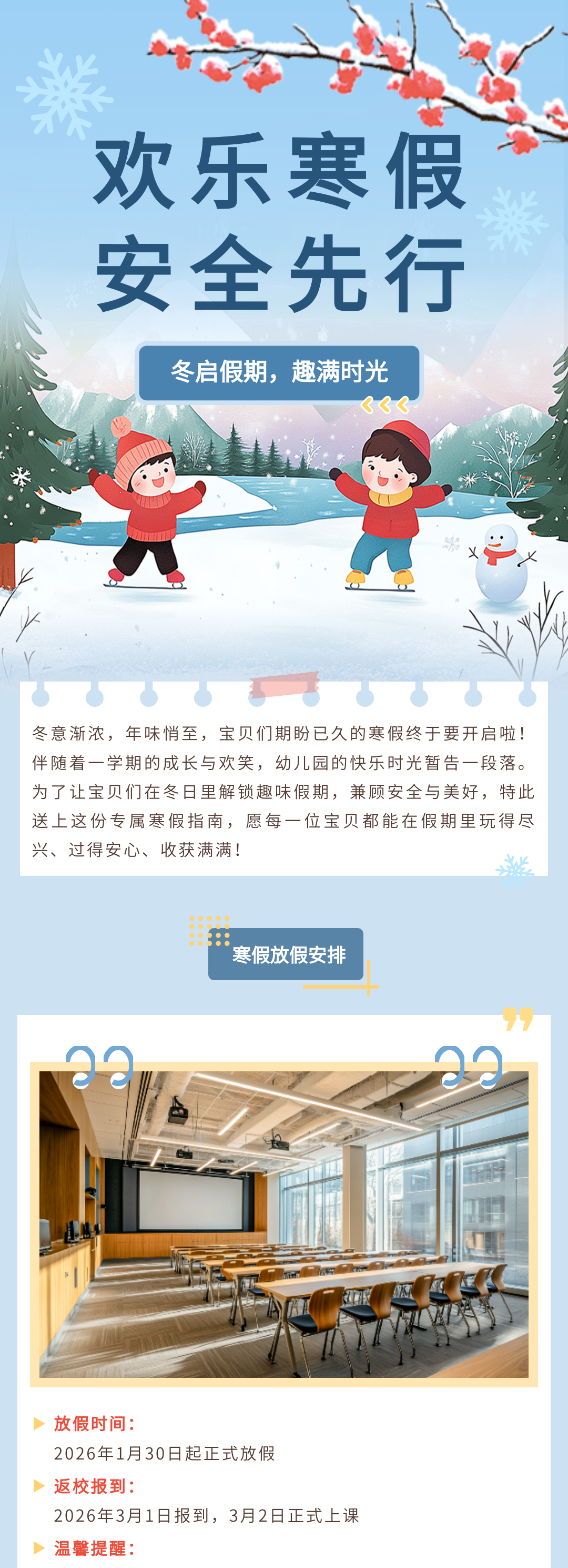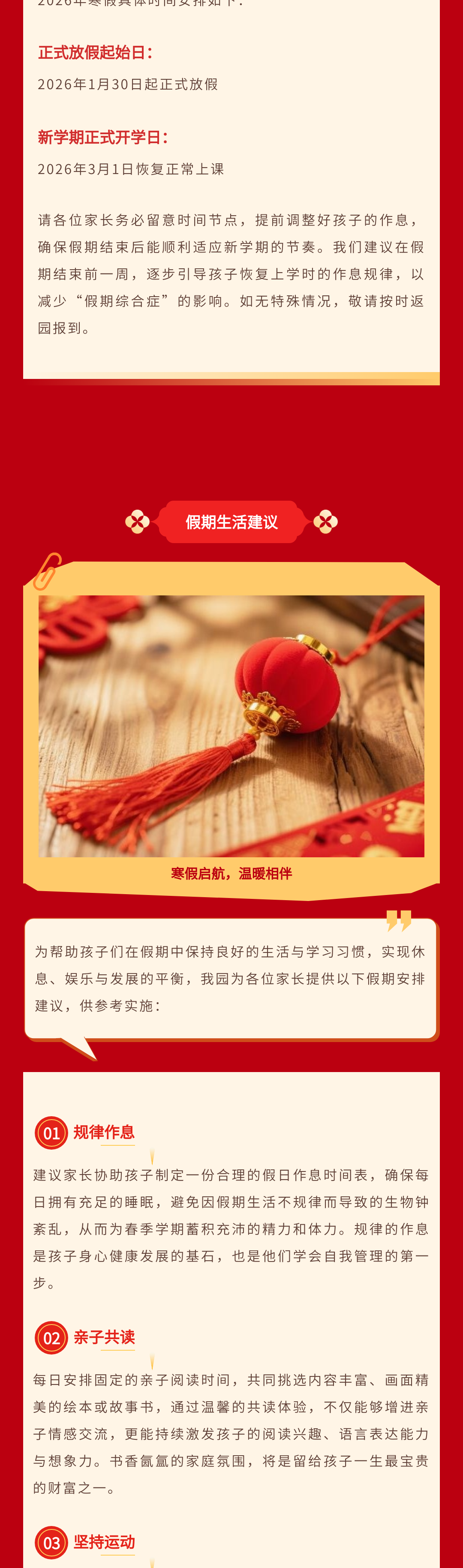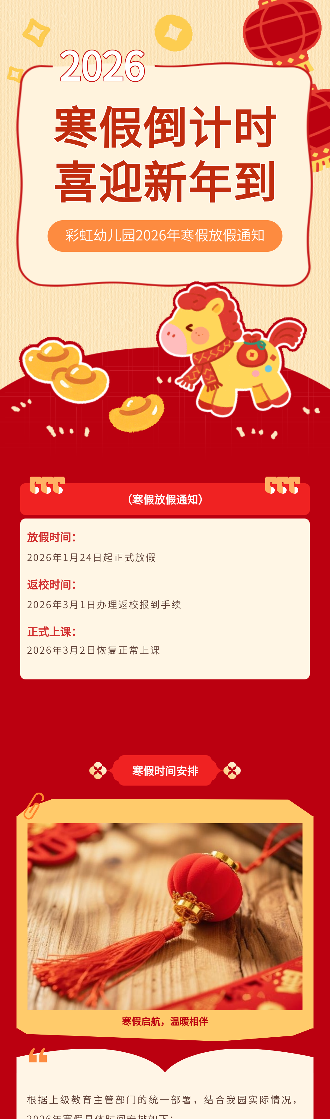 歲末將至,寒假如期。為保障學(xué)校各項(xiàng)工作平穩(wěn)銜接,確保全體師生度過平安、充實(shí)的假期,根據(jù)教學(xué)計劃及2026年春節(jié)假期安排,現(xiàn)將寒假放假時間、返校要求、及安全注意事項(xiàng)等相關(guān)事宜正式通知如下,請全體師生認(rèn)真知悉并遵照執(zhí)行。