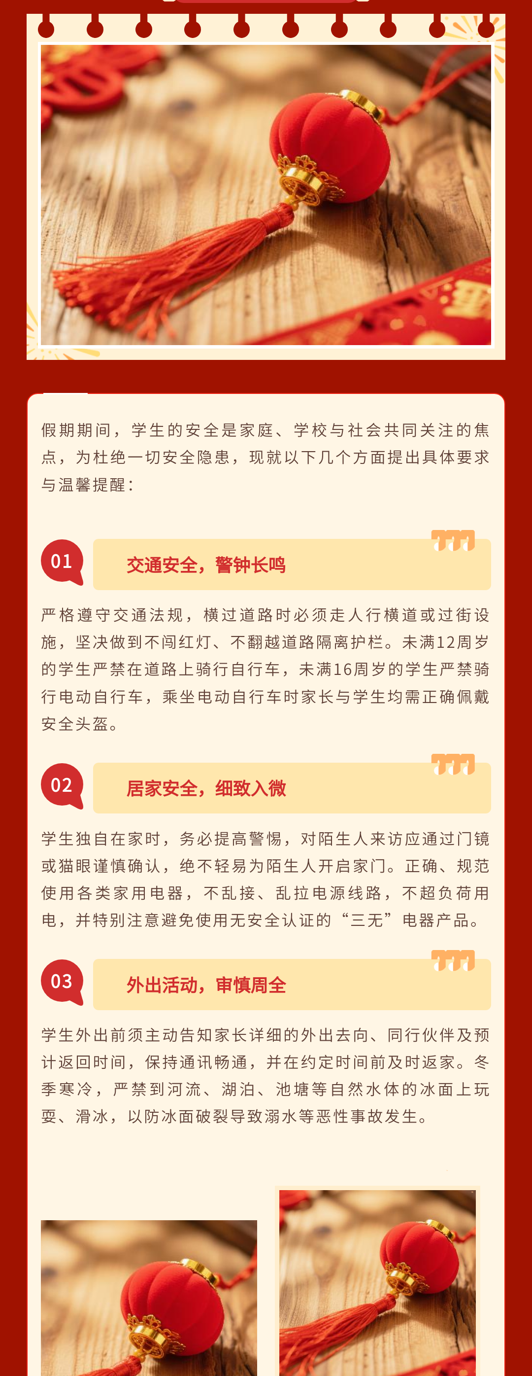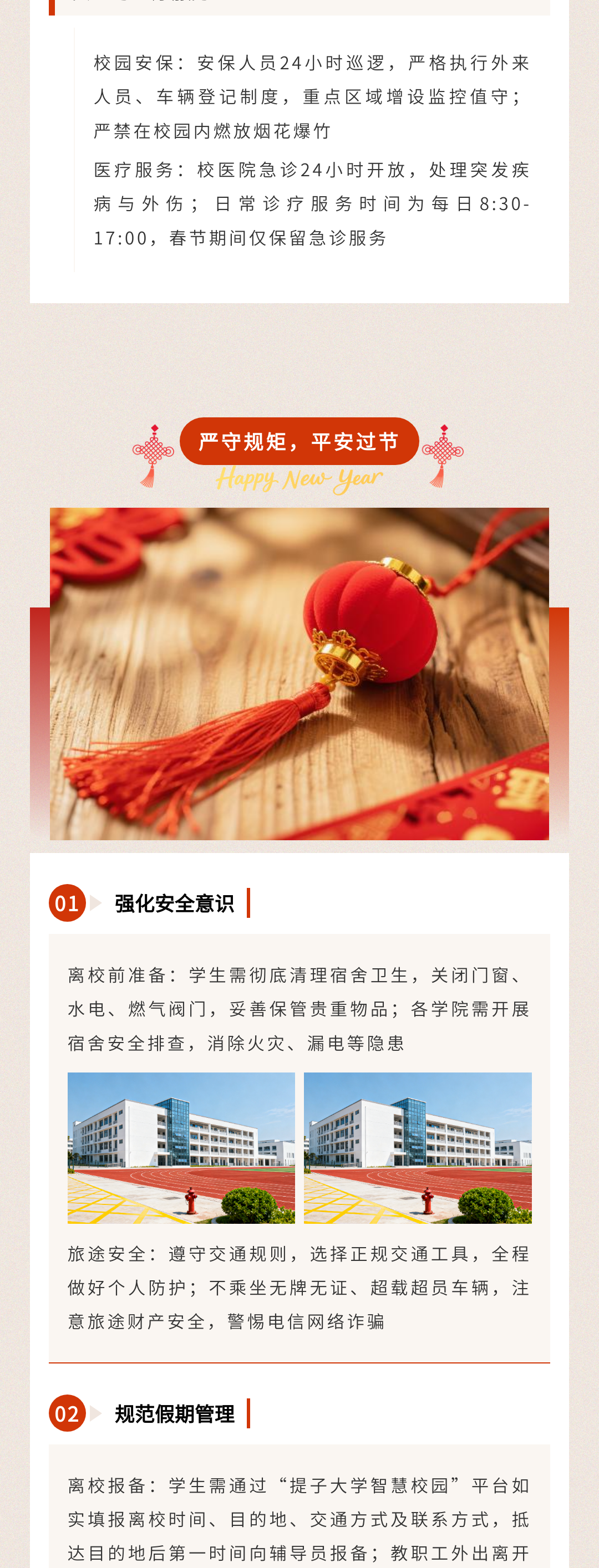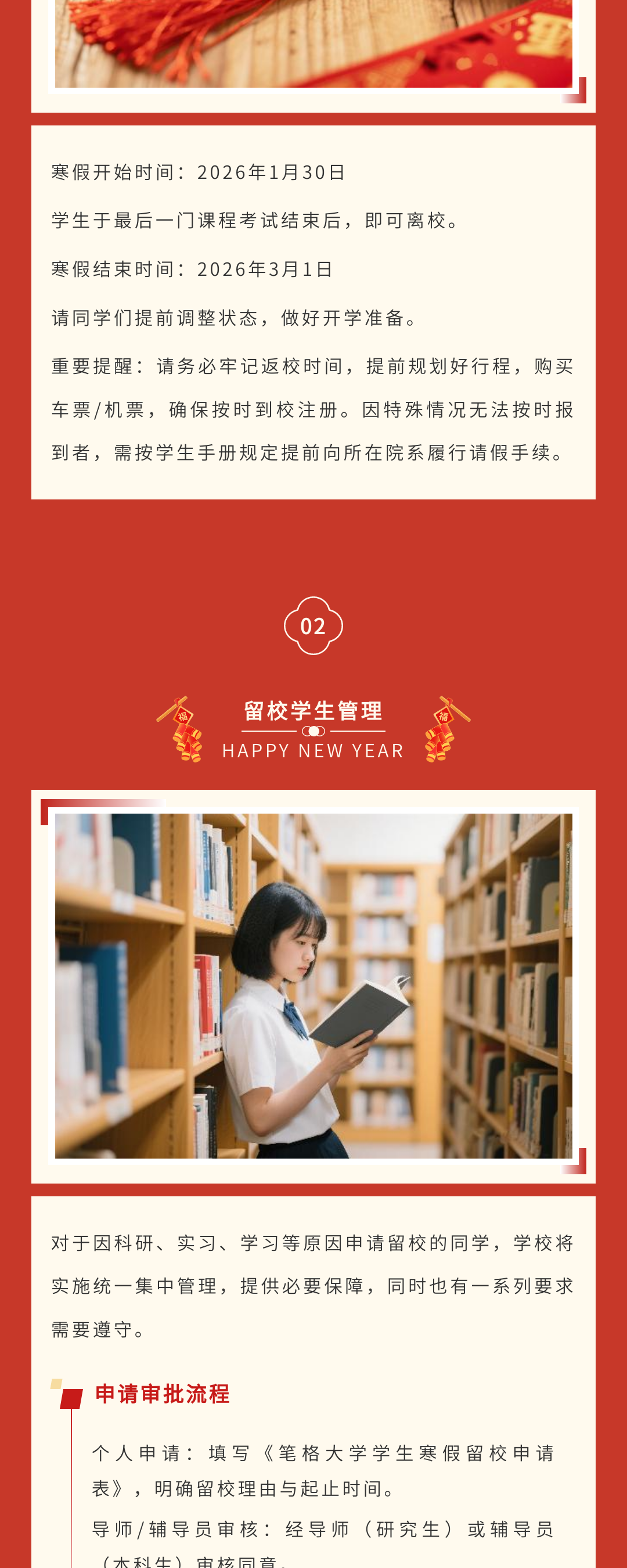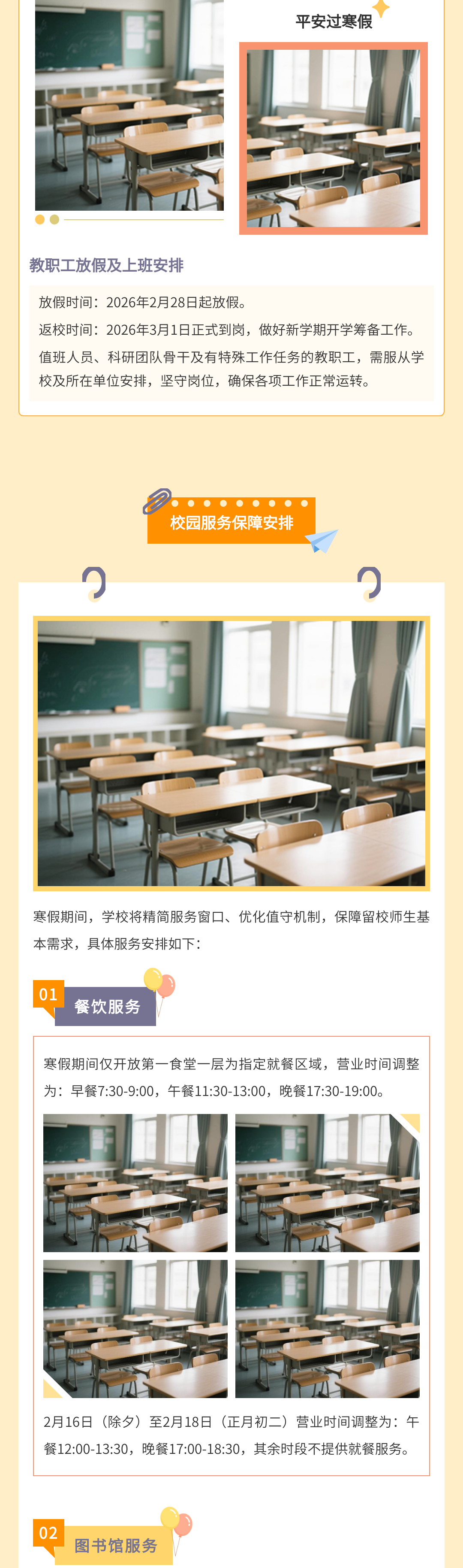 歲末將至,寒假如期。為保障學(xué)校各項(xiàng)工作平穩(wěn)銜接,確保全體師生度過平安、充實(shí)的假期,根據(jù)教學(xué)計劃及2026年春節(jié)假期安排,現(xiàn)將寒假放假時間、返校要求、及安全注意事項(xiàng)等相關(guān)事宜正式通知如下,請全體師生認(rèn)真知悉并遵照執(zhí)行。