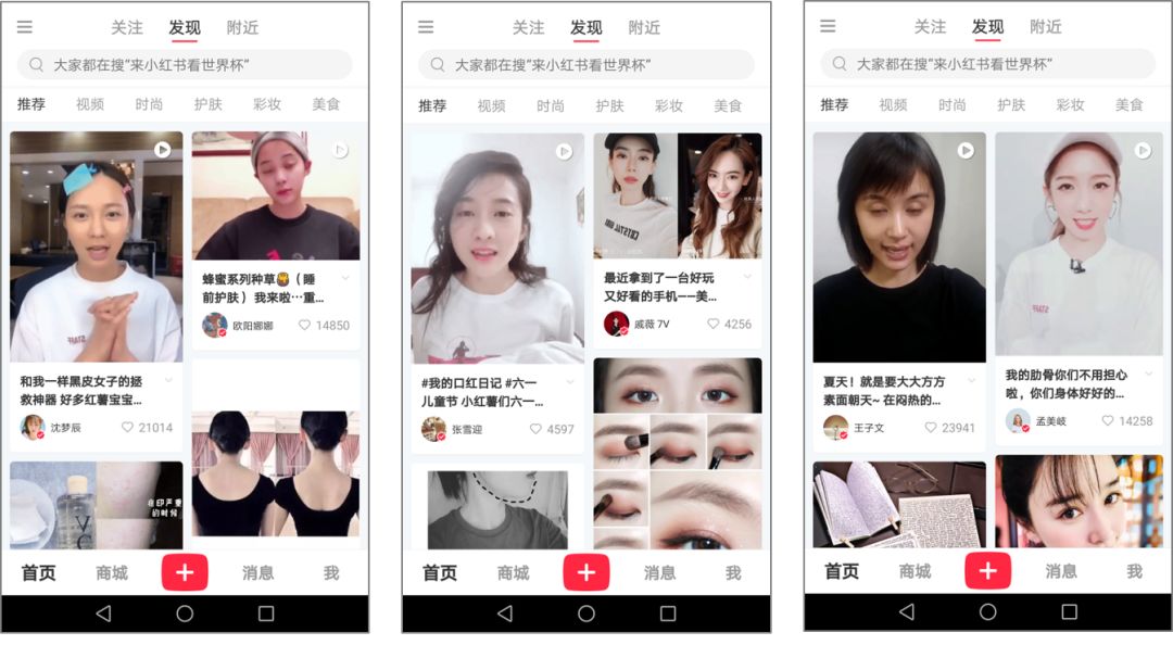 在「首頁-發(fā)現(xiàn)」下面,編輯會按照「視頻」、「時尚」、「護膚」、「彩妝」、「健身」、「美食」等將近 20 個分類,對用戶生產(chǎn)的內(nèi)容進行品類劃分。不同需求的用戶可以到不同的分類之下查看內(nèi)容。