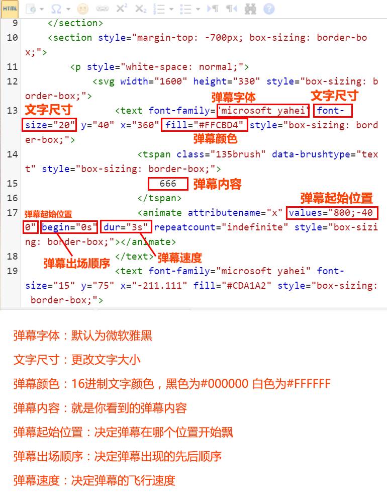 直接選擇彈幕樣式,在文本編輯框功能欄里點(diǎn)擊【HTML】,切換到代碼頁面。在代碼頁面找到下圖進(jìn)行修改。修改完成后,再次點(diǎn)擊【HTML】即可回到編輯前的頁面,示例: