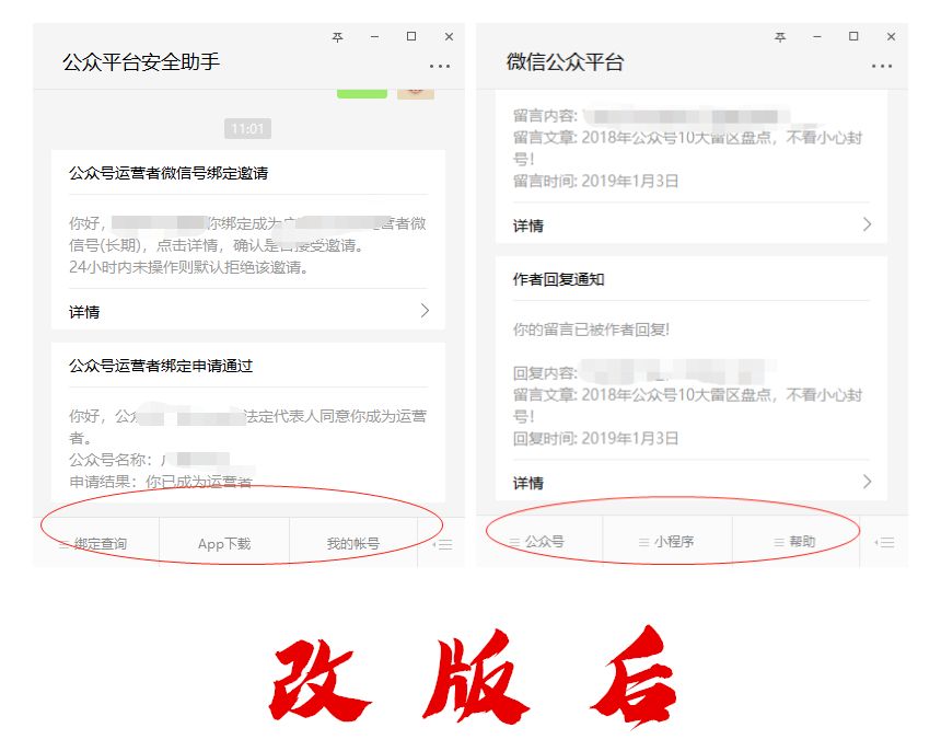 2019年1月2日,微信更改了兩個(gè)官方公眾號(hào)的菜單欄:微信公眾號(hào)平臺(tái)+公眾平臺(tái)安全助手。