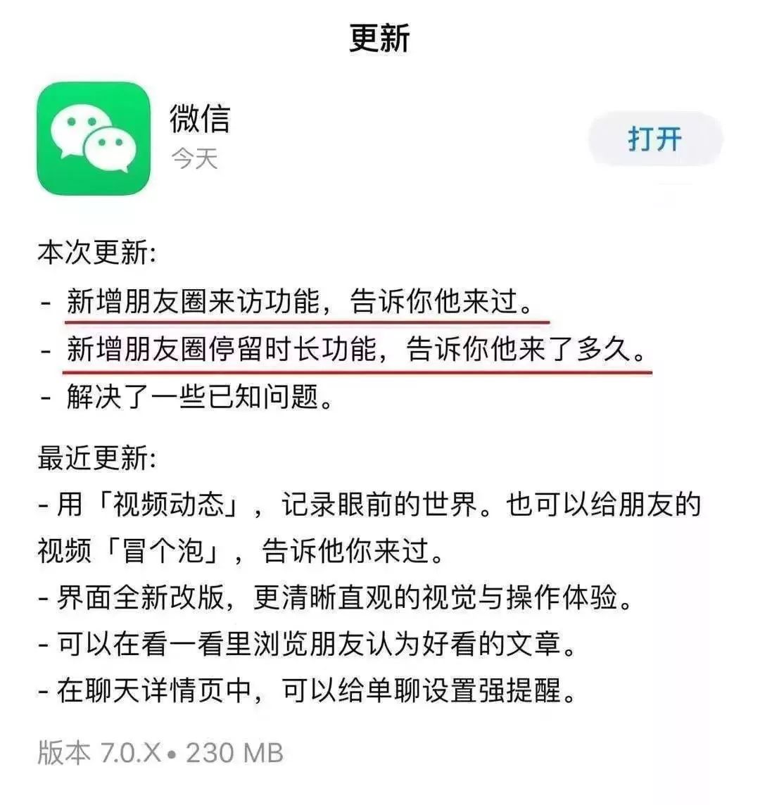 胖友們,你好哇。最近三兒在不少微信群中看到這么一張截圖,傳聞微信的7.0.X版本更新中將新增朋友圈來訪功能、停留時長功能,也就是說,你可以看見誰來過你的朋友圈、來了多久!