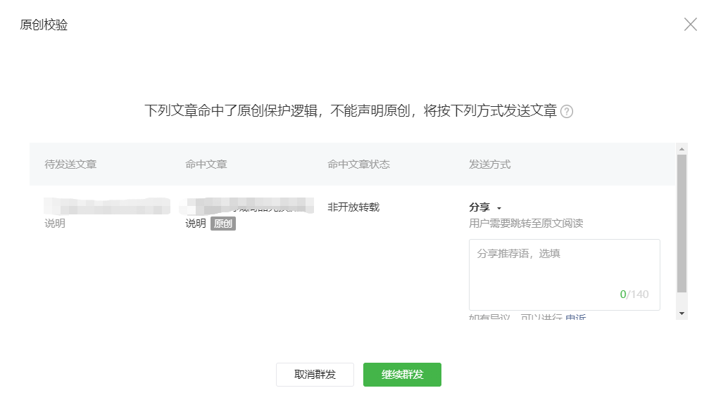 微信公眾號在群發(fā)的時候才啟用原創(chuàng)檢測機(jī)制,這對大部分人來說實在是進(jìn)退兩難,如果微信能在素材編輯的時候增加一個原創(chuàng)檢測按鈕,這樣即使文章跟其他原創(chuàng)文章撞車,還能在發(fā)布前即使修改,省了不少麻煩。