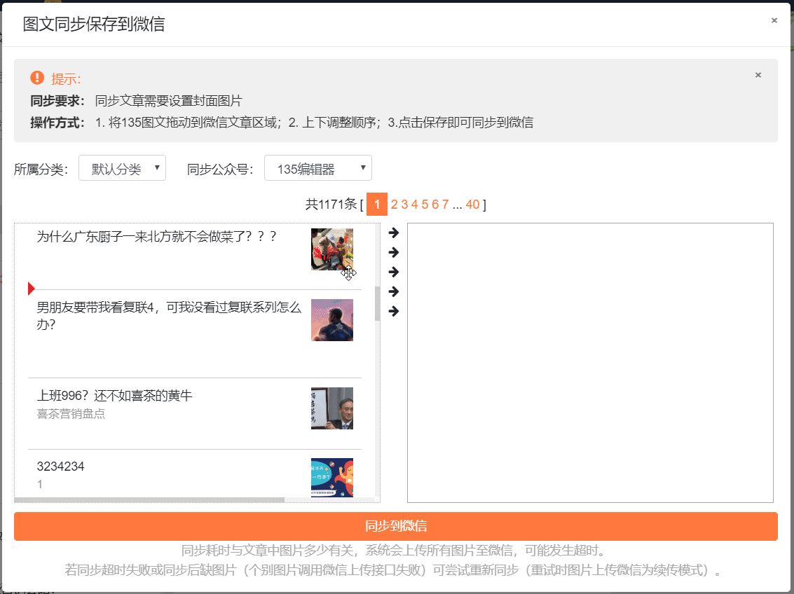 二、將需要同步的文章拖入到左邊的窗口,圖文的順序也可以通過拖動(dòng)來進(jìn)行調(diào)整。