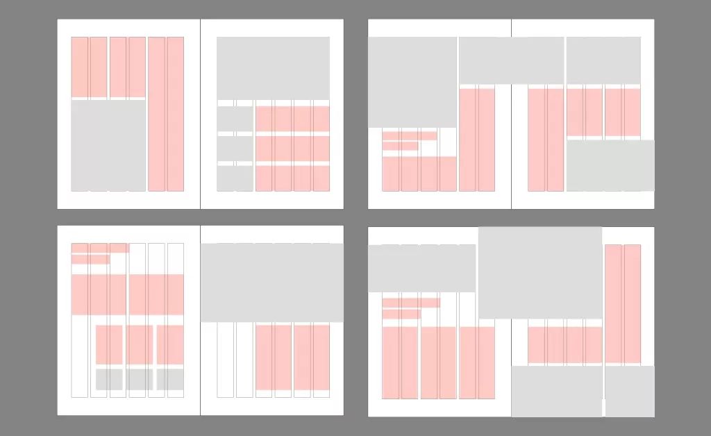 分欄是通過將整體版式垂直進(jìn)行劃分所得到的一種格式,文字內(nèi)容一般編排在分欄網(wǎng)格之中。如何處理分欄對文字的可讀性有著舉足輕重的影響。以下是針對多文字編排的版面進(jìn)行多欄網(wǎng)格的示意圖。如果是多信息的內(nèi)容編排,一般情況我都會分6欄網(wǎng)格,這樣能更好的進(jìn)行合并與拆分更靈活的網(wǎng)格。
