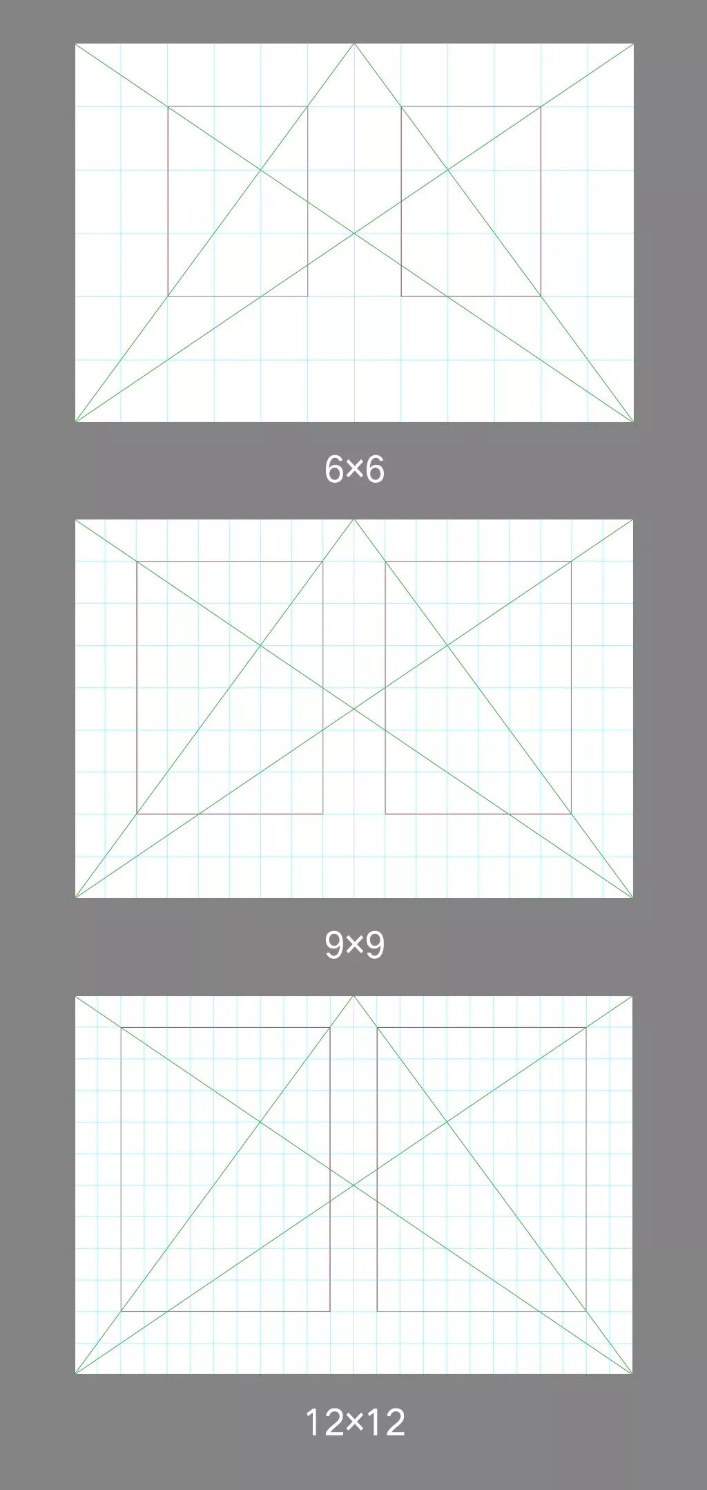 另外還能通過(guò)維拉爾系統(tǒng)繪制出六等分/九等分/十二等分(6×6,9×9和12×12)在內(nèi)的各種網(wǎng)格系統(tǒng),網(wǎng)格中的每一個(gè)小單元網(wǎng)格都和版心區(qū)域?yàn)榈缺壤P(guān)系的,所以它們相互之間都顯得格外協(xié)調(diào)。這可以讓設(shè)計(jì)師在排版時(shí)不用猜測(cè)摸索,仍然能做出賞心悅目的作品。(如下圖)