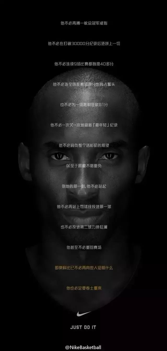 還有之前耐克NIKE為科比復(fù)出做的一個(gè)廣告我很喜歡,這里NIKE就是用了大量的具體場(chǎng)景和事實(shí)來塑造細(xì)節(jié),不僅是在致敬科比,更是凸顯出耐克品牌的拼搏精神。