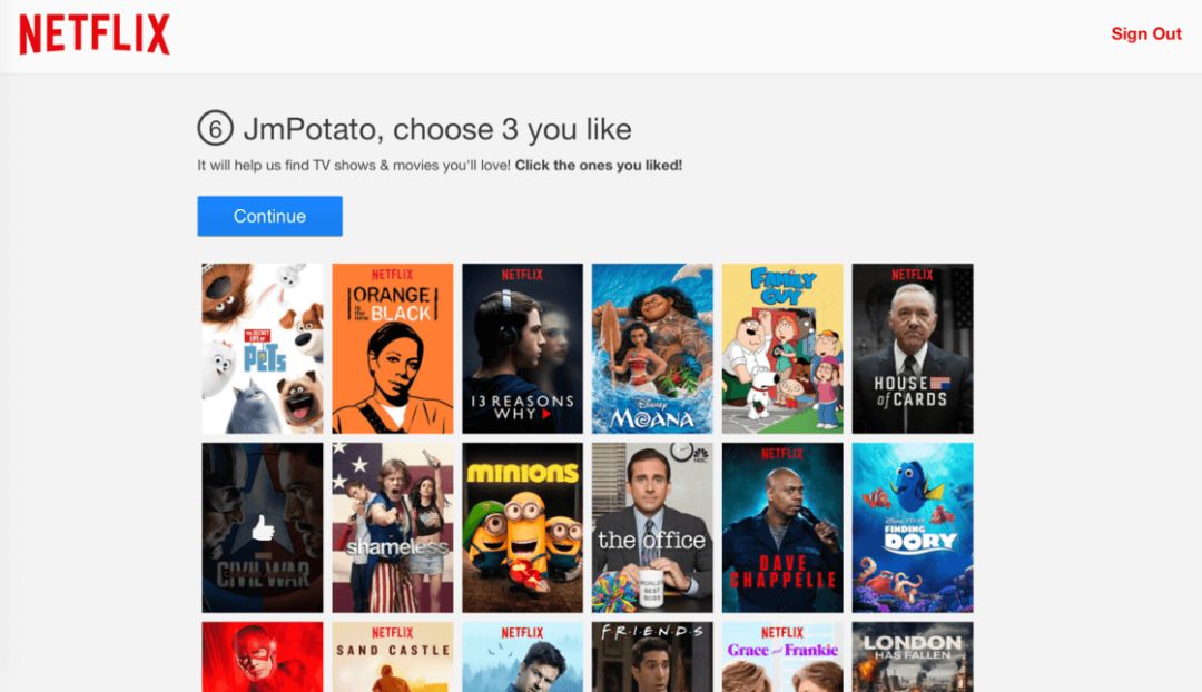 深究下來我們發(fā)現,這得益于 Netflix 的算法推薦,比如當你選擇成為 Netflix 的會員時,在完成注冊和支付驗證后,它會引導你來到一個界面,讓你在下列海報中選出一些你喜歡的或者感興趣的內容,然后根據你的選擇給你推薦內容。