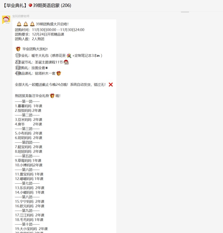氛圍營造更普遍的做法是同步購買信息,比如「寶寶玩英語」就用抱團接龍的形式,不斷同步媽媽們購買信息,讓課程顯得非?;鸨?/p>