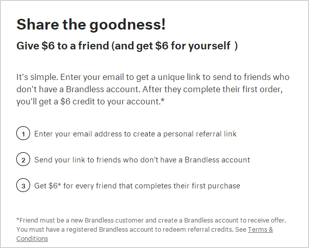 這里再舉一個國外的例子,美國一家 1 美元店,它在運營上就極其佛系。比如,在拉新方面,Brandless 只有一招,當(dāng)用戶將產(chǎn)品分享給朋友(必須是 Brandless 的新用戶),朋友完成第一次下單購買后,雙方都能獲得 6 美元的獎勵。