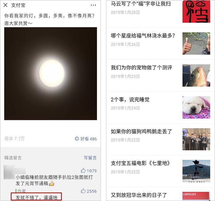 關(guān)于與用戶互動(dòng)時(shí)的人設(shè),還有一個(gè)典型的案例是支付寶的微信公眾號(hào),日常皮,日?!胺笱堋奔啊跋訔墶狈劢z,與粉絲們打成一片。
