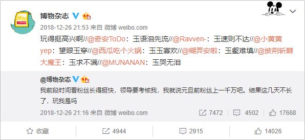 在漲粉面前,博物雜志沒有放下高冷傲嬌的架子,一條看似聲討的微博,引發(fā)粉絲連環(huán)調(diào)侃(玉是一個(gè)內(nèi)部梗),最后高冷傲嬌地評(píng)論轉(zhuǎn)發(fā),讓大家樂一樂。