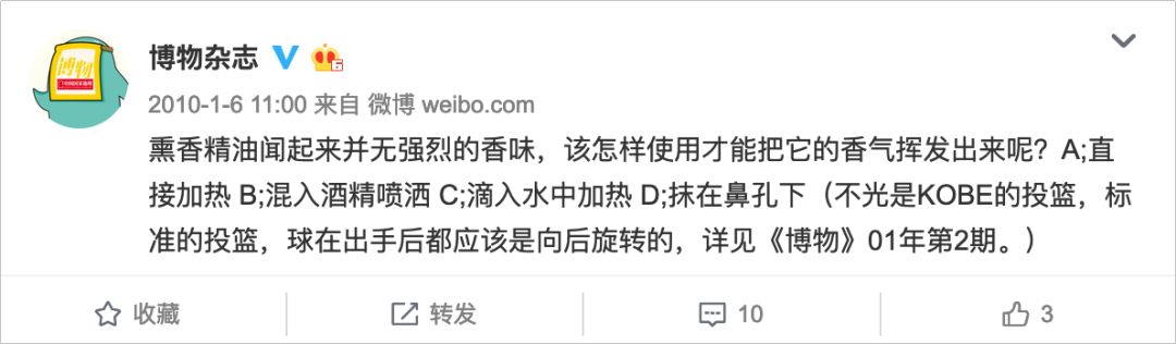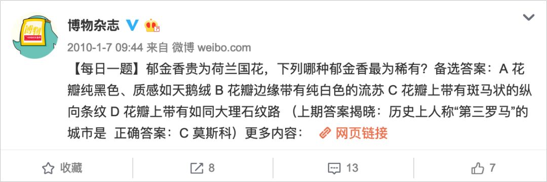 第二種是單純的科普,但是能看出來博物也下了一番功夫,比如采取專題的形式來做科普,什么“每日一題”、“博物問答”等等,試圖增加跟用戶的互動(dòng)。