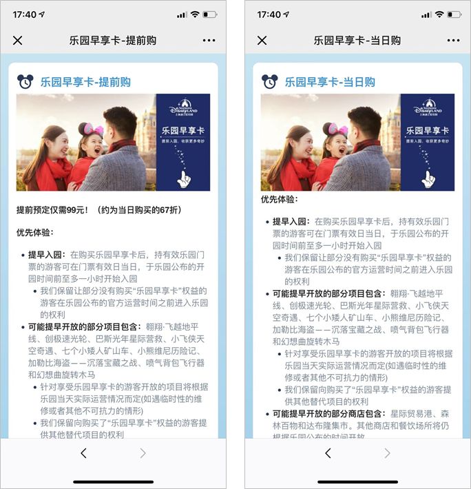 它有一項(xiàng)升級(jí)年卡的活動(dòng),意思就是你買了門票去迪士尼玩,就可以在當(dāng)天憑門票去辦理升級(jí)年卡。當(dāng)日辦卡可以用門票抵扣同等金額的錢,補(bǔ)充余下金額就可以獲得年卡。(兩日門票不可升級(jí))