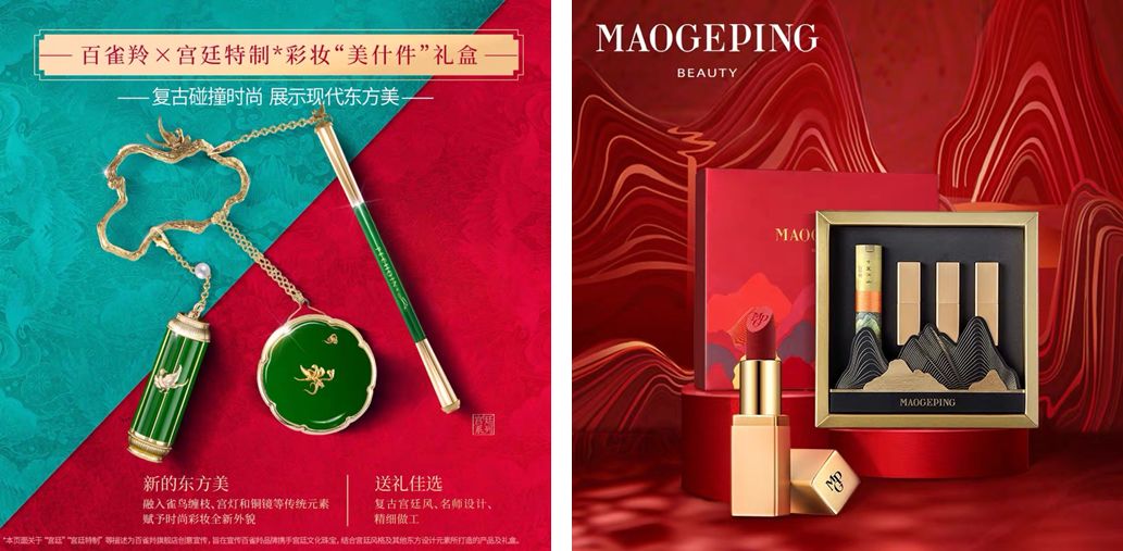 比如,在如今國貨彩妝正當(dāng)潮時(shí),故宮與經(jīng)典國貨品牌百雀羚、毛戈平都聯(lián)名推出了彩妝禮盒,產(chǎn)品包括眼影、口紅、粉底等產(chǎn)品。