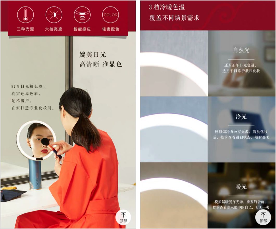 還有自然光、冷光、暖光三種光源,模擬不同場景,六擋亮度可調(diào):1-2 檔適合日常護(hù)膚,3-4 檔適合全臉化妝,5-6 檔眼眉唇上妝……真的是精致到不行。