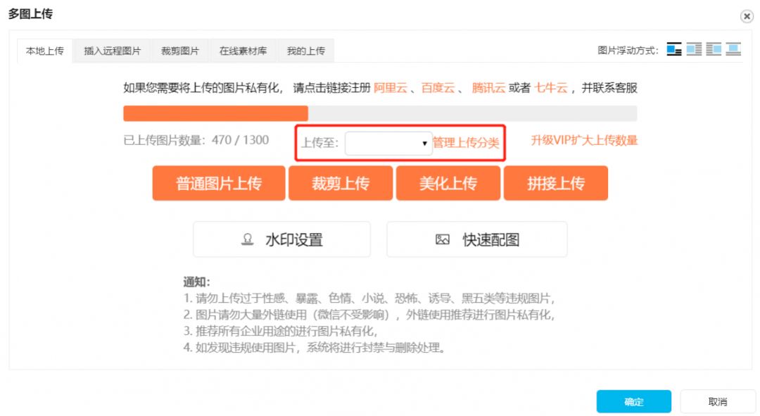 進(jìn)入到圖片上傳界面以后,我們可以為即將上傳的圖片設(shè)置分組。如果你還沒有設(shè)置圖片的分組,點(diǎn)擊【管理上傳分類】,就可以為圖片添加分組啦!