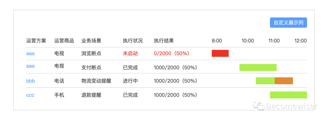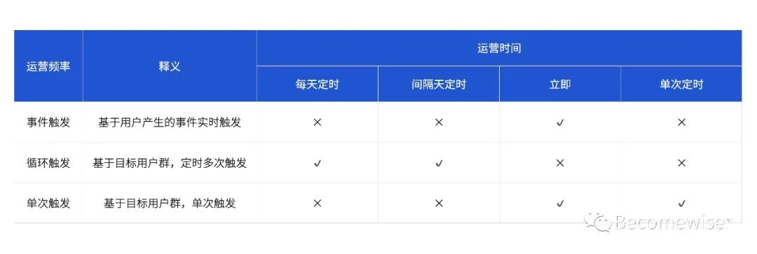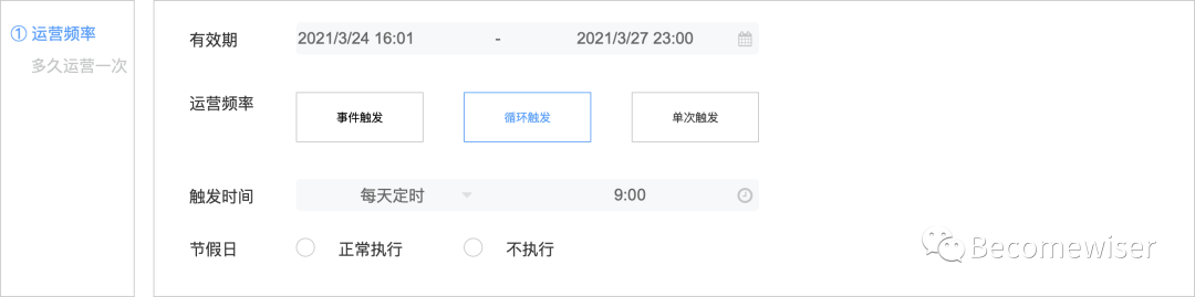交互,顧名思義是交流與互動(dòng)。規(guī)則引擎負(fù)責(zé)規(guī)則組合,而交互內(nèi)容負(fù)責(zé)規(guī)則最后的一個(gè)節(jié)點(diǎn):執(zhí)行。我們希望做用戶運(yùn)營(yíng)便需要與用戶產(chǎn)生聯(lián)系,這則依賴于能夠觸及用戶的渠道,不同的渠道又有各自特點(diǎn)交互內(nèi)容。這一章節(jié)沒有太多復(fù)雜的底層支持邏輯,基本就是渠道能力的建設(shè),渠道內(nèi)容的維護(hù)和管理,更多要關(guān)注的反而是視野。這幅圖枚舉了大致可能與用戶交互的渠道以及渠道支持承載的內(nèi)容方式,渠道不僅推送,還有企微這類私域的聊天訊息,其次還有電話對(duì)應(yīng)的人工服務(wù)以及站內(nèi)的資源位。下發(fā)的內(nèi)容也不僅是文字、圖片,也可以下發(fā)任務(wù)或者獎(jiǎng)品。任務(wù)可以理解為你希望用戶完成的事情,獎(jiǎng)品則是完成什么事情后你所要提供的激勵(lì)。在這里大家可能會(huì)有的疑問是,落地頁(yè)不就一般承載了任務(wù)和獎(jiǎng)品么,這一點(diǎn)來說是的。但就是有的場(chǎng)景會(huì)沒有落地頁(yè),例如智能外呼、短信。這時(shí)候則會(huì)運(yùn)用到通用化的用戶任務(wù)體系和獎(jiǎng)品了。至于說內(nèi)容的產(chǎn)品支持工具,還包含二維碼、海報(bào)、短鏈、落地頁(yè)生成等,這些產(chǎn)品怎么實(shí)現(xiàn)并不是這篇文章的重點(diǎn),這里也不做描述了。4-2、產(chǎn)品表現(xiàn):方案管理及方案配置做運(yùn)營(yíng)的痛點(diǎn)是:管理困難、成本高及上線周期長(zhǎng)。線上的列表視圖只是最淺層的管理,我們還應(yīng)該還應(yīng)提供不同類型的視圖幫助運(yùn)營(yíng)同學(xué)了解運(yùn)營(yíng)方案的運(yùn)行狀況和業(yè)務(wù)邏輯。而成本、周期的問題,則應(yīng)通過自助化、一站式、可視化的配置來解決,這個(gè)部分則依賴則是4-1的底層支持。方案管理,首先定義何為運(yùn)營(yíng)方案,它包含三部分:目標(biāo)用戶、運(yùn)營(yíng)策略、效果評(píng)估。對(duì)方案的管理,常見的是列表視圖,包含基礎(chǔ)的列表及列表篩選。這一點(diǎn)就不描述了,而當(dāng)我們要了解業(yè)務(wù)運(yùn)行狀況時(shí)就會(huì)使用到:執(zhí)行視圖、邏輯視圖等。從運(yùn)營(yíng)的角度,任何的投放類的運(yùn)營(yíng)基本都涉及到KPI,先無論效果如何,每個(gè)運(yùn)營(yíng)策略要先關(guān)注執(zhí)行是否按時(shí)、按量執(zhí)行。這是運(yùn)營(yíng)效果的基礎(chǔ)。時(shí)間部分,主要分為開始時(shí)間、持續(xù)時(shí)間,部分的業(yè)務(wù)是對(duì)任務(wù)完成時(shí)效有強(qiáng)訴求的。而量級(jí)部分首要的是任務(wù)的成功率,在產(chǎn)品設(shè)計(jì)時(shí)再往前做一步還可以基于對(duì)應(yīng)方案的總量級(jí)、成功量級(jí)做同比或者做趨勢(shì),方便我們定位問題。邏輯視圖,承載了運(yùn)營(yíng)方案的邏輯。其次想幫助運(yùn)營(yíng)同學(xué)建立運(yùn)營(yíng)的全局視角。這一部分對(duì)于不同的產(chǎn)品形態(tài)、業(yè)務(wù)目標(biāo),其差異就很大了,下圖舉一個(gè)基于商品的邏輯視圖。商品視圖是單一商品在不同的運(yùn)營(yíng)場(chǎng)景,在什么時(shí)間節(jié)點(diǎn)、使用了什么渠道進(jìn)行運(yùn)營(yíng)。每一個(gè)渠道都可能擁有自己的細(xì)分目標(biāo),點(diǎn)擊“目標(biāo):引導(dǎo)加購(gòu)”,則能夠進(jìn)入詳細(xì)的運(yùn)營(yíng)方案,從而查看運(yùn)營(yíng)邏輯。第二幅圖則是從品類的角度,來查看場(chǎng)景運(yùn)營(yíng)是否缺失,這個(gè)視圖不關(guān)注渠道、時(shí)間等具體的細(xì)節(jié)。這只是2個(gè)示例,大家可以基于自己的業(yè)務(wù)形態(tài)去設(shè)計(jì)自己的管理視圖。上文的商品視圖,只承載了邏輯的一部分,更詳細(xì)的邏輯則會(huì)進(jìn)入運(yùn)營(yíng)方案頁(yè)面。它包含了運(yùn)營(yíng)方案的面向用戶、運(yùn)營(yíng)策略、評(píng)估指標(biāo)。接下來為大家講解的部分是,一個(gè)方案配置的表現(xiàn)層是怎樣的。配置的方式,業(yè)界主要有2類,一類是流程視圖,另一類是表單視圖。流程視圖可以參考釘釘宜搭、易觀數(shù)科,在這里只做簡(jiǎn)單的圖片展示:表單視圖,也是比較主流的方式。個(gè)人的設(shè)計(jì)將運(yùn)營(yíng)方案拆分為了4個(gè)部分:運(yùn)營(yíng)頻率、面向用戶、運(yùn)營(yíng)策略、效果評(píng)估。這一小節(jié),先闡述前3小點(diǎn)。一個(gè)運(yùn)營(yíng)方案,首先要處理的是在什么時(shí)間范圍內(nèi)運(yùn)營(yíng),其次是以什么樣的頻率在什么時(shí)間運(yùn)營(yíng)。事件觸發(fā)則不依賴時(shí)間,基于事件發(fā)生實(shí)時(shí)觸發(fā),這一類型沒有運(yùn)營(yíng)時(shí)間的概念。而循環(huán)觸發(fā)、單次觸發(fā)則會(huì)有時(shí)間的概念。循環(huán)觸發(fā),是指多次的觸發(fā)任務(wù),觸發(fā)事件僅適用于每日定時(shí)任務(wù),間隔日定時(shí)任務(wù)。對(duì)間隔日定時(shí)任務(wù)舉一個(gè)例子輔助理解:每周一都要上班。單次觸發(fā),則是一次性的任務(wù)了,可以是方案建立后立即發(fā)送或者定一個(gè)創(chuàng)建方案完畢后的時(shí)間進(jìn)行發(fā)送。這個(gè)部分,在講解用戶數(shù)據(jù)