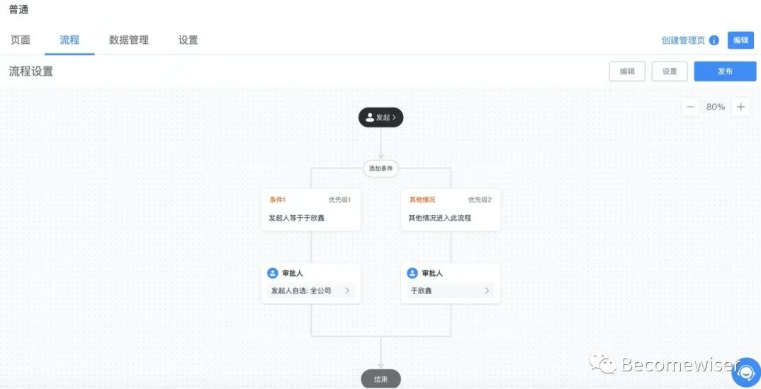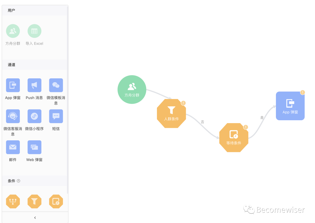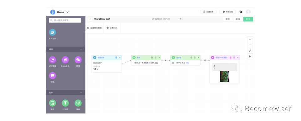 這里又來到了耳熟能詳?shù)牡?W2H法環(huán)節(jié),規(guī)則引擎是什么時(shí)間對(duì)什么人在什么地方以什么方式做什么事(5押)。什么時(shí)間做和對(duì)誰做是觸發(fā)條件,對(duì)誰做在實(shí)時(shí)事件觸發(fā)的場(chǎng)景,例如用戶簽到立即下發(fā)獎(jiǎng)品,這種情況事件即是觸發(fā)條件又是判斷條件的一部分。判斷條件的本質(zhì)是過濾,例如過濾昨日簽到用戶中的黑產(chǎn)用戶,除了用戶本身的特征,我們還會(huì)接入風(fēng)控、推薦等接口。流程控制從計(jì)算機(jī)運(yùn)算角度是改變流程執(zhí)行順序的指令,淺層的理解為判斷條件和執(zhí)行條件的銜接器。在實(shí)際運(yùn)營(yíng)中不一定每次判斷生效都會(huì)立即執(zhí)行,會(huì)加以時(shí)間等待或者分組執(zhí)行。例如:當(dāng)用戶訪問頁(yè)面后等待15分鐘觸發(fā)運(yùn)營(yíng)邏輯,等待指令就是流程控制。執(zhí)行條件就相對(duì)簡(jiǎn)單了,但在思考的時(shí)候不要被束縛。一切對(duì)用戶的運(yùn)營(yíng)干預(yù)手段都可以是我們的覆蓋范圍,無論是觸達(dá)還是彈窗,無論是非人工、人工還是智能,做B端重要的是連接和共贏。理解了規(guī)則引擎核心的4要素,下一個(gè)問題就是如何能夠讓研發(fā)、產(chǎn)品、運(yùn)營(yíng)不同的角色都可以使用,適用的角色每向前一步,易用性就更高一層。如果連研發(fā)敏捷提升都無法做到,那這套引擎就沒有存在的意義了。關(guān)于敏捷,我理解的是低代碼或者無代碼實(shí)現(xiàn)運(yùn)營(yíng)需求,并且能夠自主測(cè)試無須發(fā)版,所以對(duì)應(yīng)的解決方案是可視化的拖拉拽,上圖是易觀數(shù)科的智能運(yùn)營(yíng)Work Flow,是一個(gè)很好的案例。但對(duì)比no code我個(gè)人還是傾向于low code,no code基本是通用的模型和標(biāo)準(zhǔn)化的模版,無需研發(fā)、人力投入,即可快速上線應(yīng)用。它可以參考網(wǎng)頁(yè)、活動(dòng)等標(biāo)準(zhǔn)化服務(wù)的提供商,這種方式的缺陷是,強(qiáng)依賴于模版。如果不具備適合的模版,其實(shí)用性會(huì)大打折扣,而且很難兼容復(fù)雜邏輯,最簡(jiǎn)單實(shí)際上也最不靈活。low code,則是通過建設(shè)一些基礎(chǔ)設(shè)施,實(shí)現(xiàn)部分邏輯配置、部分編碼,實(shí)現(xiàn)部分邏輯可配置,測(cè)試可自助。適用于有一定研發(fā)理解能力的產(chǎn)品、運(yùn)營(yíng)等同學(xué)。
