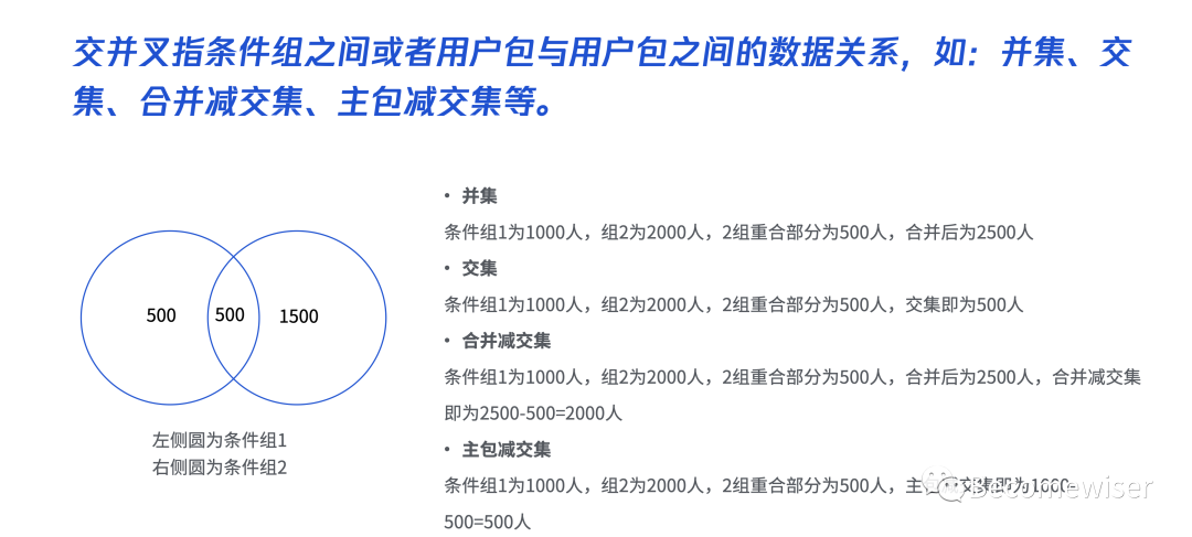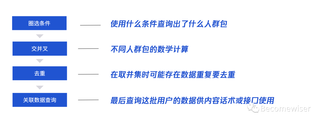 時(shí)間條件一般不會(huì)進(jìn)行枚舉,因?yàn)槿兆右惶焯斓脑谶^,很難將它數(shù)清楚。其對(duì)應(yīng)的條件選擇交互式日歷選擇器或日歷范圍選擇器,而動(dòng)態(tài)時(shí)間則一般使用T+N的形式,在這里T指的當(dāng)時(shí)(一般為天),而N也可以為負(fù)數(shù)。例如:關(guān)注時(shí)間=T-1,意思為1日前關(guān)注的用戶。而數(shù)字、字符串的比較方式都相對(duì)接近,只是數(shù)字和時(shí)間能夠有“大于”、“小于”這類的比較方式,但字符串沒有。前面的部分描述的是如何選取用戶,而這一部分則是選了后還要做的事情。其執(zhí)行流程如下:通過條件查詢得到了人群包,然后對(duì)不同人群包進(jìn)行交并叉相關(guān)的數(shù)學(xué)計(jì)算。在計(jì)算后進(jìn)行數(shù)據(jù)去重,最后再查詢這批用戶的數(shù)據(jù)提供于內(nèi)容話術(shù)及接口使用。接下來詳細(xì)介紹下這幾種服務(wù):