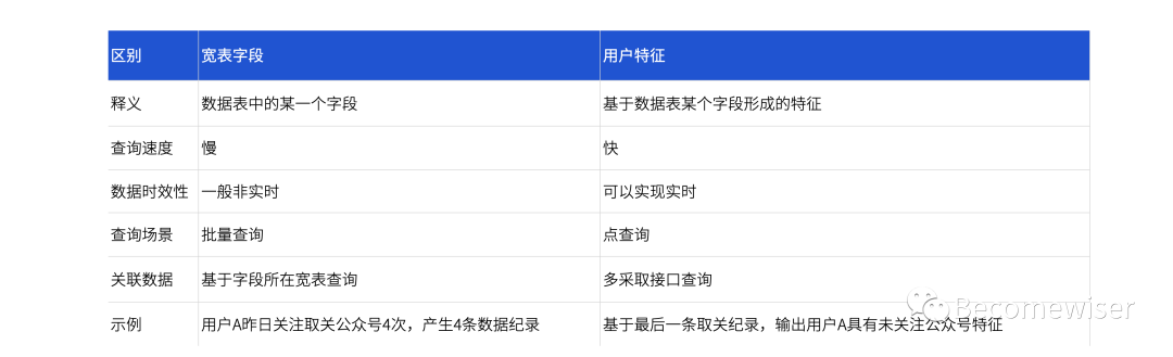 在這里額外描述一下關(guān)于“用戶特征”和“寬表字段”的區(qū)別,詳見下圖: