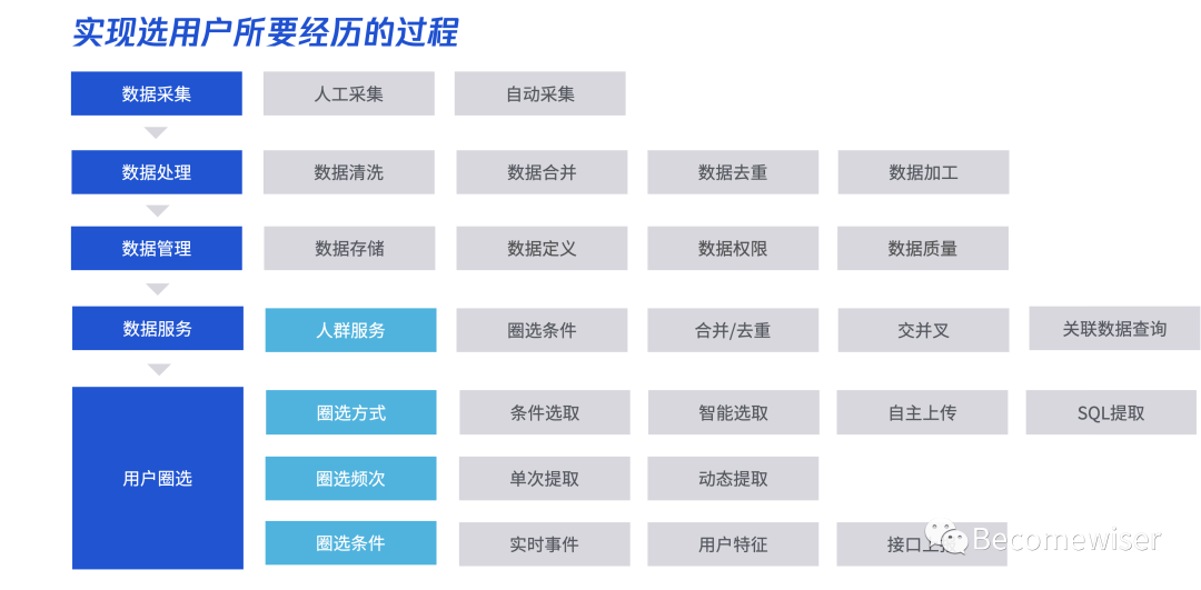 選用戶對(duì)應(yīng)前文的痛點(diǎn)是數(shù)據(jù)不可用,我們要讓數(shù)據(jù)可用,也要解決數(shù)據(jù)分散的問題,將分散在不同業(yè)務(wù)的用戶數(shù)據(jù)進(jìn)行關(guān)聯(lián),識(shí)別是否是同一用戶。最終實(shí)現(xiàn)可視化選取目標(biāo)用戶。3-1、底層支持:用戶數(shù)據(jù)平臺(tái)要讓數(shù)據(jù)可用,需要建設(shè)的是用戶數(shù)據(jù)平臺(tái),它是一切的開始。哪怕不用于實(shí)際干預(yù)用戶的運(yùn)營(yíng),進(jìn)行畫像分析、個(gè)性化推薦也離不開它。從用戶運(yùn)營(yíng)平臺(tái)的角度,我們要去采集全站的數(shù)據(jù)讓數(shù)據(jù)多元客觀,然后去過濾掉無效、異常的值,在關(guān)聯(lián)成為同一用戶,保障畫像更為立體。最后則是將一條條明細(xì)的數(shù)據(jù),加工成可用的圈選條件,并將其供給運(yùn)營(yíng)。理解表現(xiàn)層之前先了解其底層支持,知其然也知其所以然。