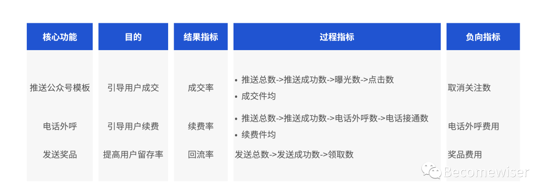 ROI的計(jì)算公式,相比傳統(tǒng)的計(jì)算方法額外多了一個(gè)參數(shù):“負(fù)向指標(biāo)經(jīng)濟(jì)價(jià)值”。道理也很簡(jiǎn)單,每發(fā)一篇公眾號(hào)文章,有人關(guān)注也會(huì)有人取關(guān),有正向也當(dāng)然會(huì)有負(fù)向。但這并不是說不需要繼續(xù)運(yùn)營(yíng)了,而是要讓分子大于0,并且盡可能的靠近、超出分母。以上圖的第二個(gè)例子進(jìn)行解讀,假設(shè)是某東Plus會(huì)員年卡,臨近過期用戶仍未進(jìn)行續(xù)費(fèi),這時(shí)平臺(tái)運(yùn)營(yíng)會(huì)將這部分用戶推送至外呼專席,由外呼同學(xué)引導(dǎo)用戶進(jìn)行續(xù)費(fèi)。