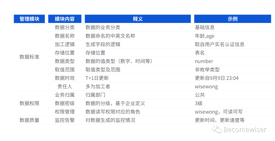 合并的目標(biāo)有2個(gè),一方面是關(guān)聯(lián)不同業(yè)務(wù)的核心數(shù)據(jù),讓用戶畫像更為立體。另一方面,在離線查詢大批量的時(shí)候查詢速度能夠更快。不同的數(shù)據(jù)存儲(chǔ)在不同的表,我們希望在查詢訂單時(shí)同時(shí)查詢用戶的關(guān)注數(shù)據(jù),常見的辦法是連表查詢。但這種方法只適合小量的數(shù)據(jù),當(dāng)數(shù)據(jù)量達(dá)到百萬級(jí)開始連表查詢就會(huì)非常慢了,而這個(gè)時(shí)候就會(huì)用到寬表,它可以理解為一張擁有大量數(shù)據(jù)字段的表。例如在訂單表增加用戶的公眾號(hào)關(guān)注數(shù)據(jù)。加工邏輯,則涉及到條件的組合。我們的原子數(shù)據(jù)如:年齡、性別,這是可以直接使用的查詢條件,但如果我們想要的是“中年男性”這個(gè)條件,就涉及到加工了,它能讓我們查詢數(shù)據(jù)時(shí)更加敏捷。數(shù)據(jù)采集、處理后下一個(gè)環(huán)節(jié)是數(shù)據(jù)管理,它是數(shù)據(jù)服務(wù)的基礎(chǔ),它負(fù)責(zé)定義數(shù)據(jù)標(biāo)準(zhǔn),管理數(shù)據(jù)權(quán)限,并保障數(shù)據(jù)質(zhì)量。