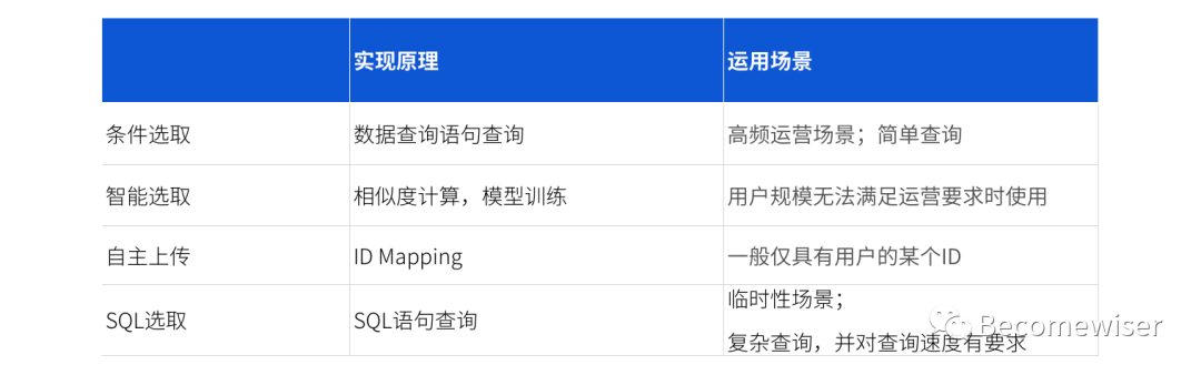智能選取、自主上傳、SQL選取,是對(duì)“條件選取”的補(bǔ)充。智能選取主流分為2類,1類是用戶規(guī)模無法滿足要求時(shí)對(duì)用戶進(jìn)行相似度計(jì)算,從而擴(kuò)大用戶的規(guī)模。另類的運(yùn)用場(chǎng)景則是運(yùn)用算法模型選取用戶,結(jié)合運(yùn)營(yíng)的效果數(shù)據(jù)對(duì)模型進(jìn)行調(diào)優(yōu),不斷尋找最優(yōu)的高響應(yīng)人群。