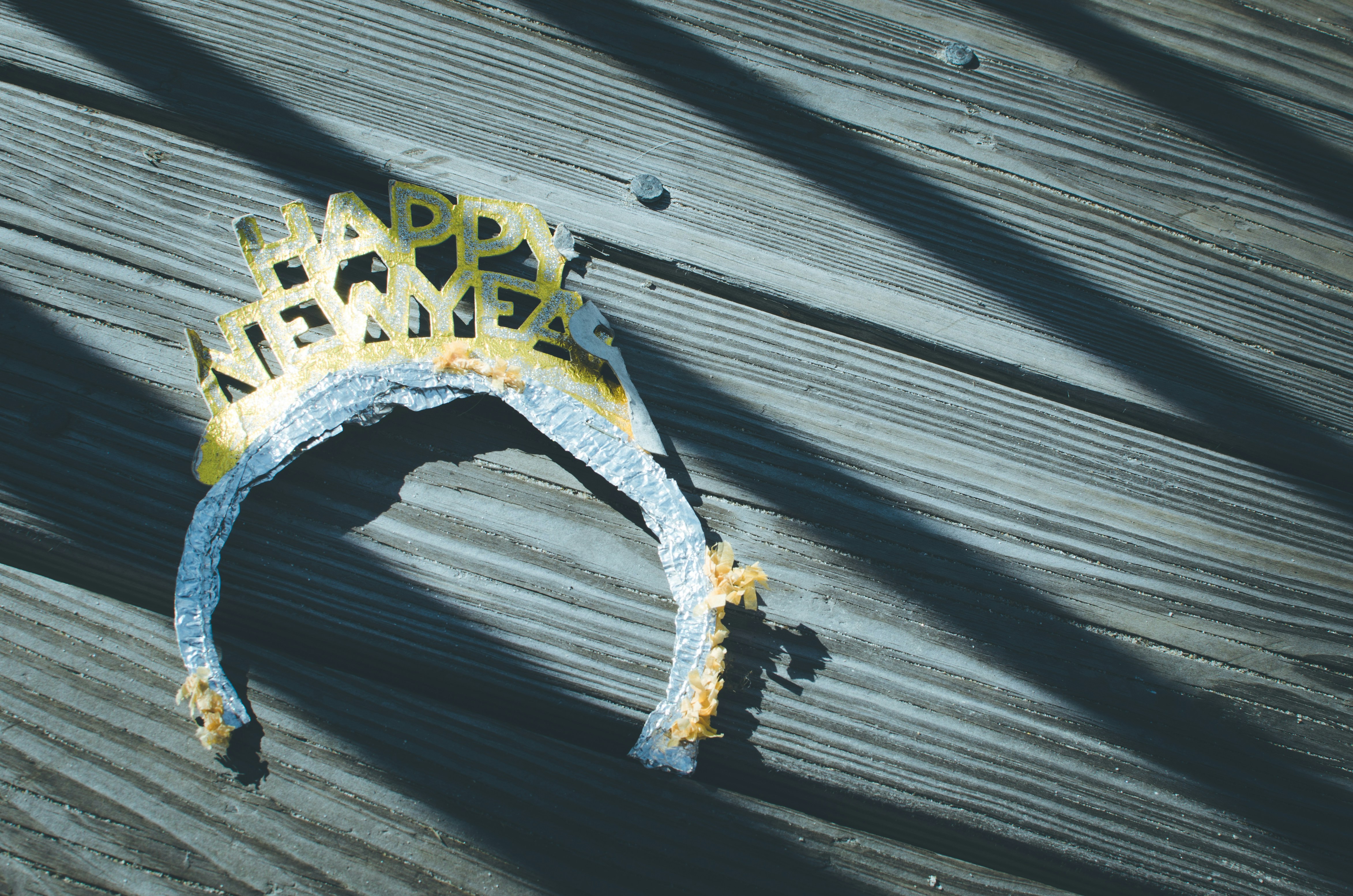 大洋城木板地板上廢棄的新年快樂頭巾