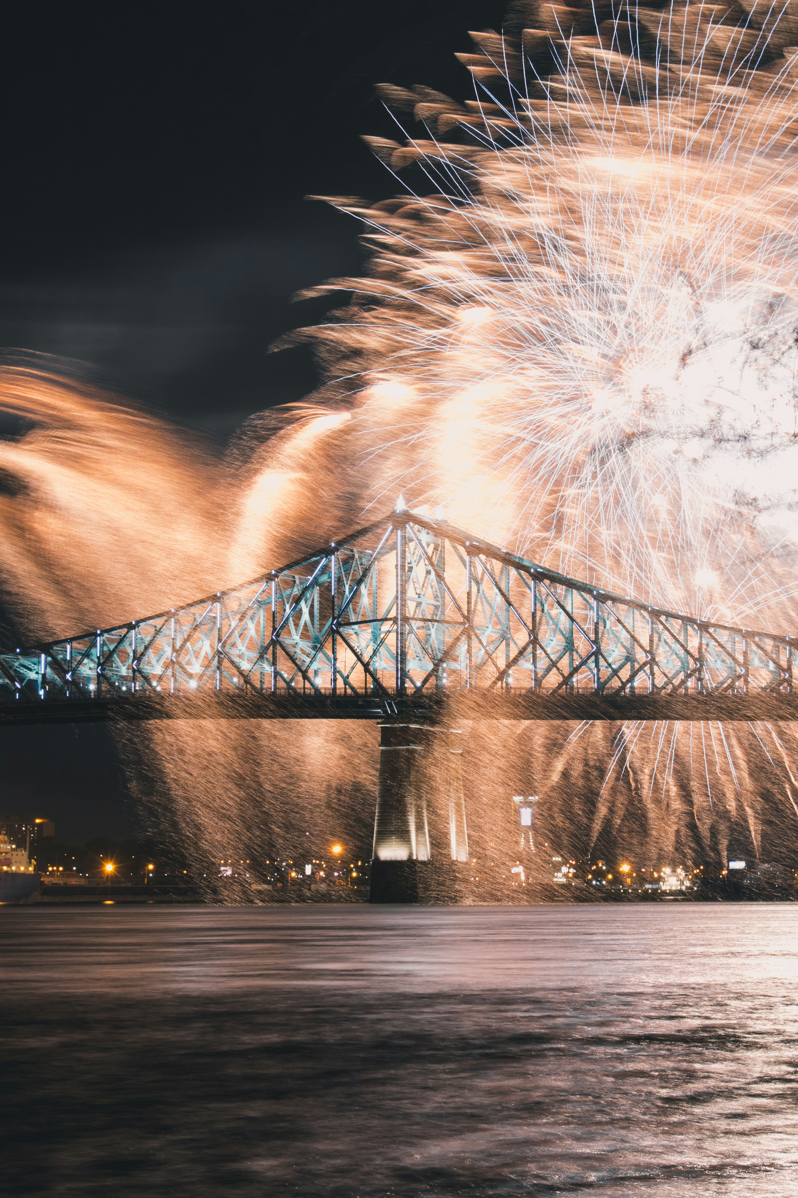 橋、煙火、燈光、夜晚、河流、慶典、長時間曝光、道路、城市景觀、水、夜晚、黑暗、河流、湖泊、藍(lán)色、橙色、蓬特卡地爾、蓬特、加拿大、魁北克