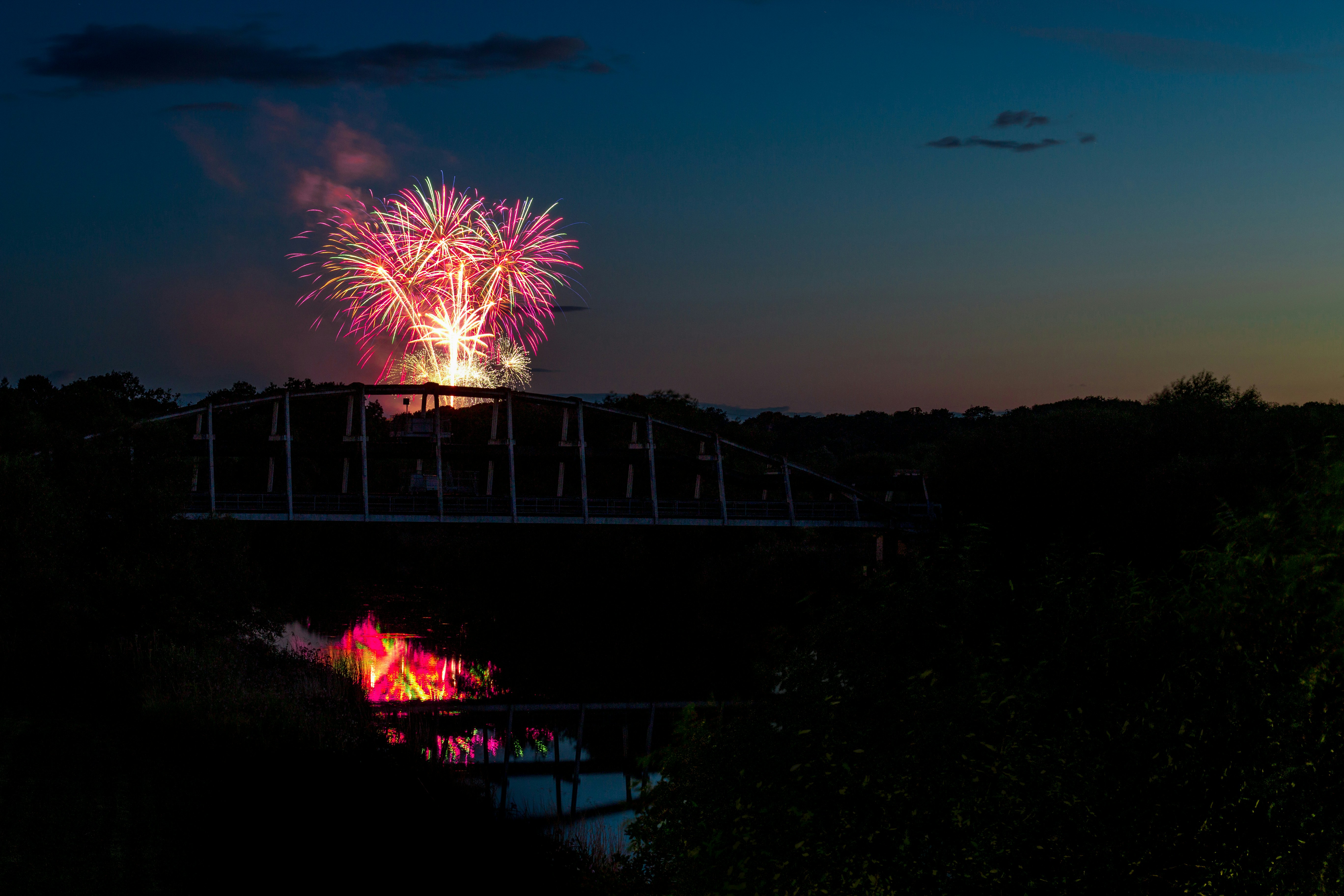 橋梁、倒影、天空、云彩、煙火、日落、日出、藍(lán)色、黑暗、夜晚、輪廓、爆炸、水、光、河、50毫米、佳能、長曝光、火焰、五彩繽紛