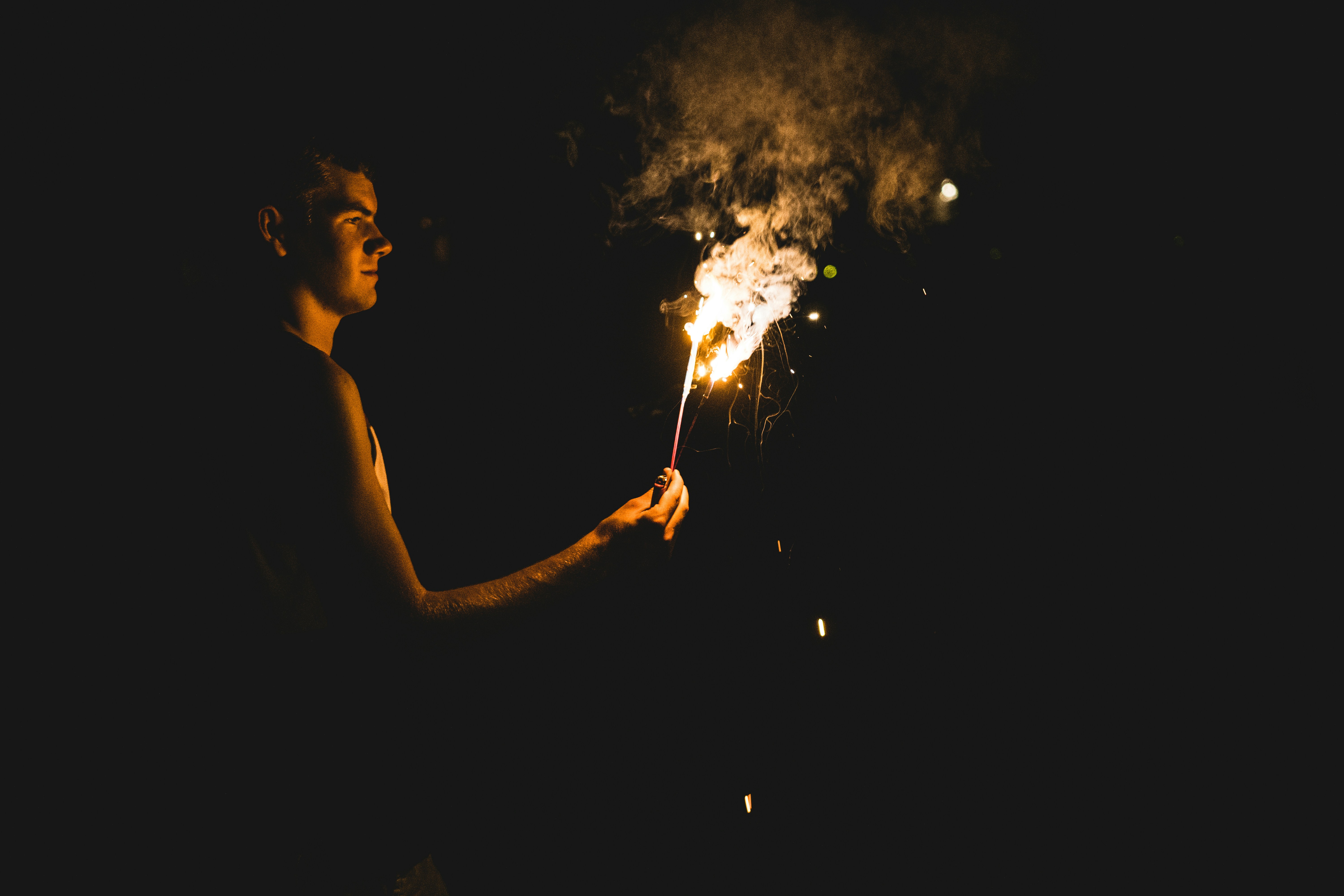 夜晚,黑暗,男人,男孩,火,火焰,煙,棒,火花,焰火,照明,火花,蠟燭,七月的第四,慶祝,新年