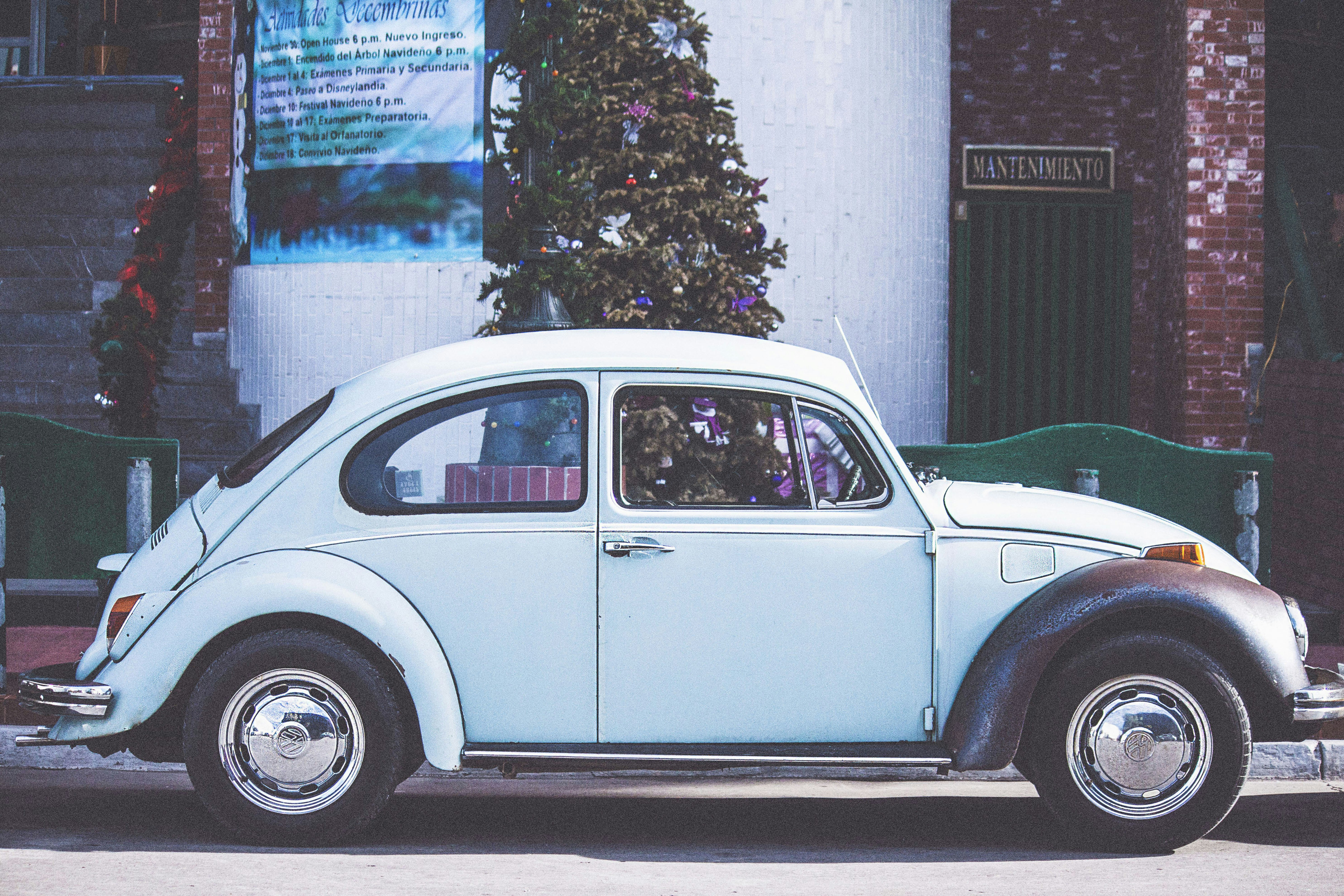 復(fù)古藍(lán)大眾甲蟲(chóng)停在圣誕樹(shù)前的街道和藍(lán)色海報(bào)