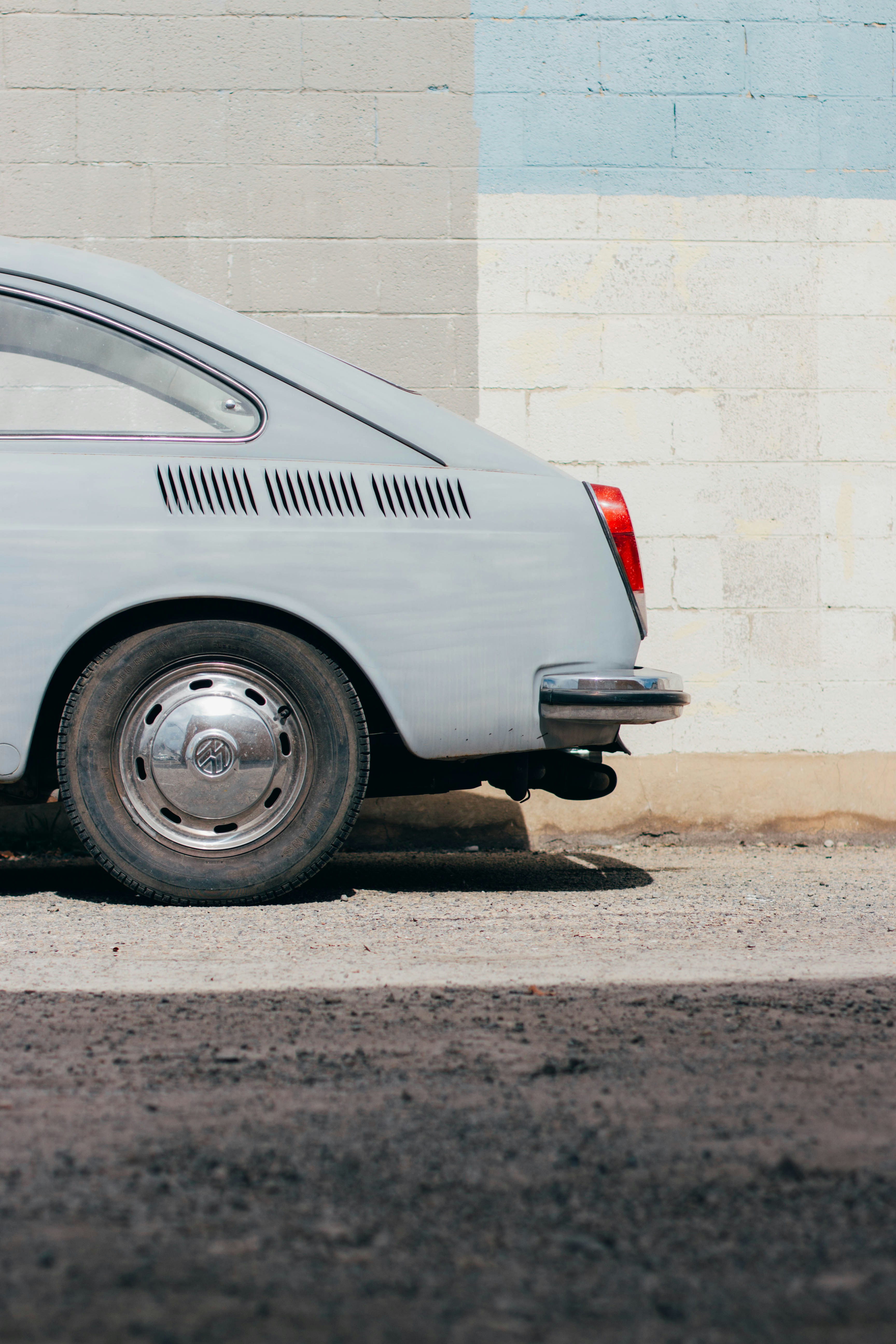后輪胎,藍(lán)色大眾的紅色大燈停在藍(lán)色、白色、灰色墻壁旁邊的道路上
