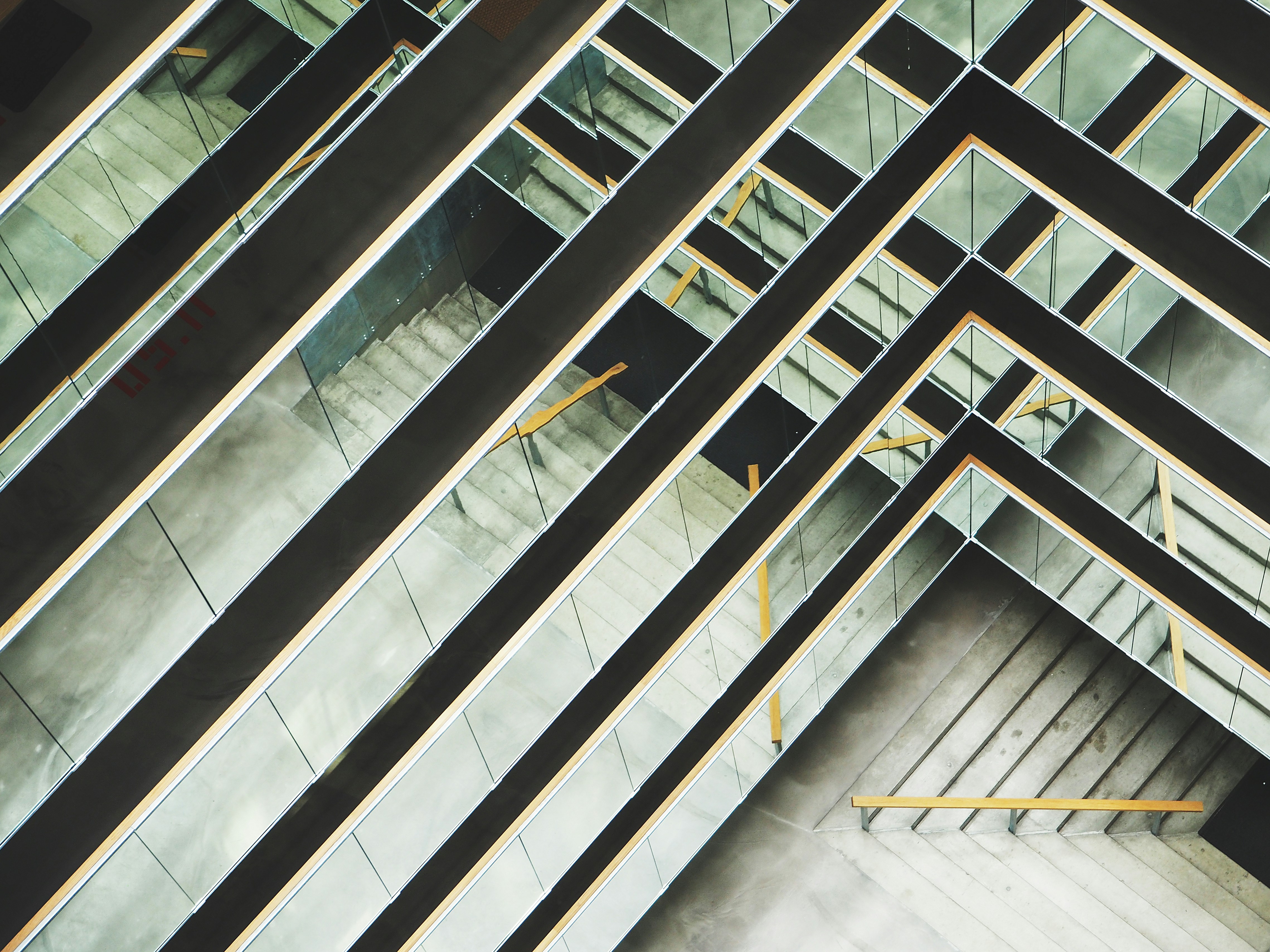 俯瞰一面有鏡子墻的辦公樓的樓梯