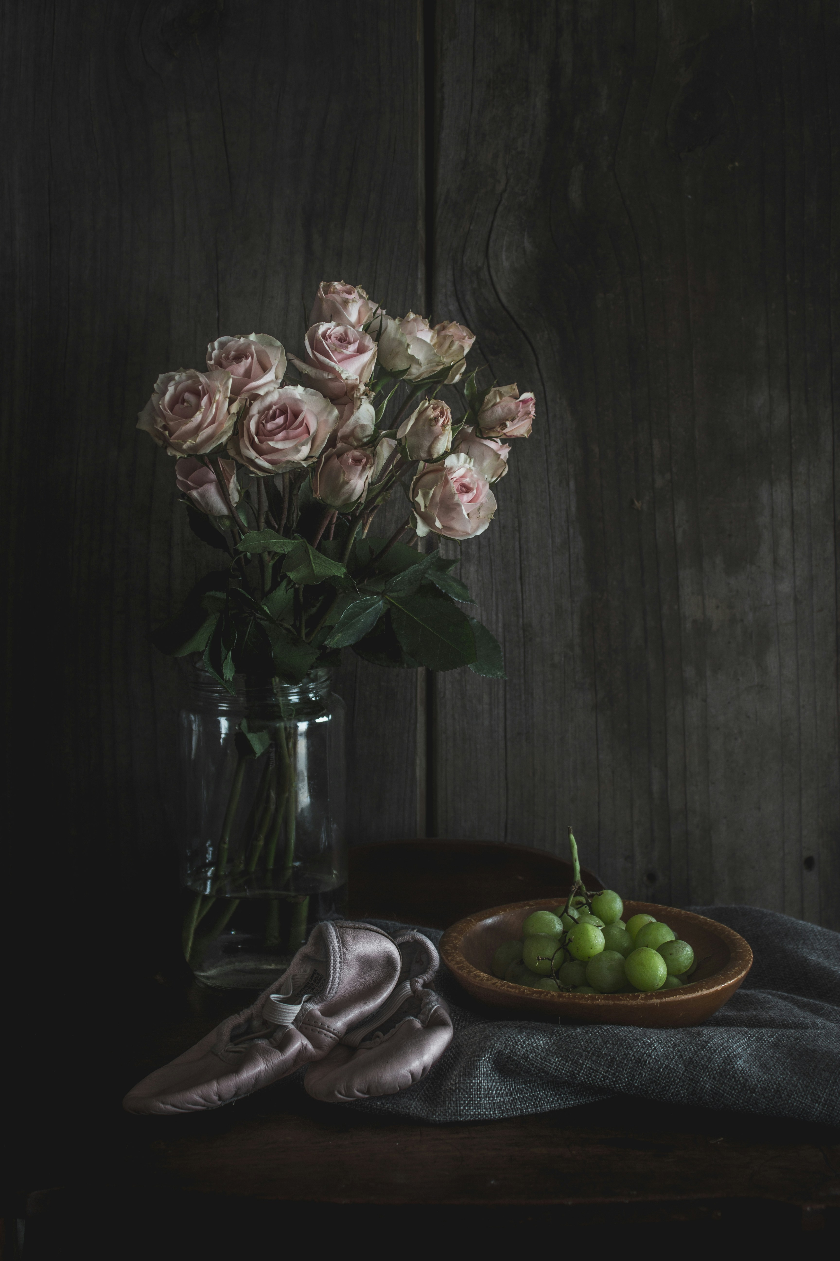 鮮花,玫瑰,罐子,樹葉,粉紅,花束,葡萄,綠色,碗,芭蕾舞鞋,拖鞋,鞋子,死命,葡萄