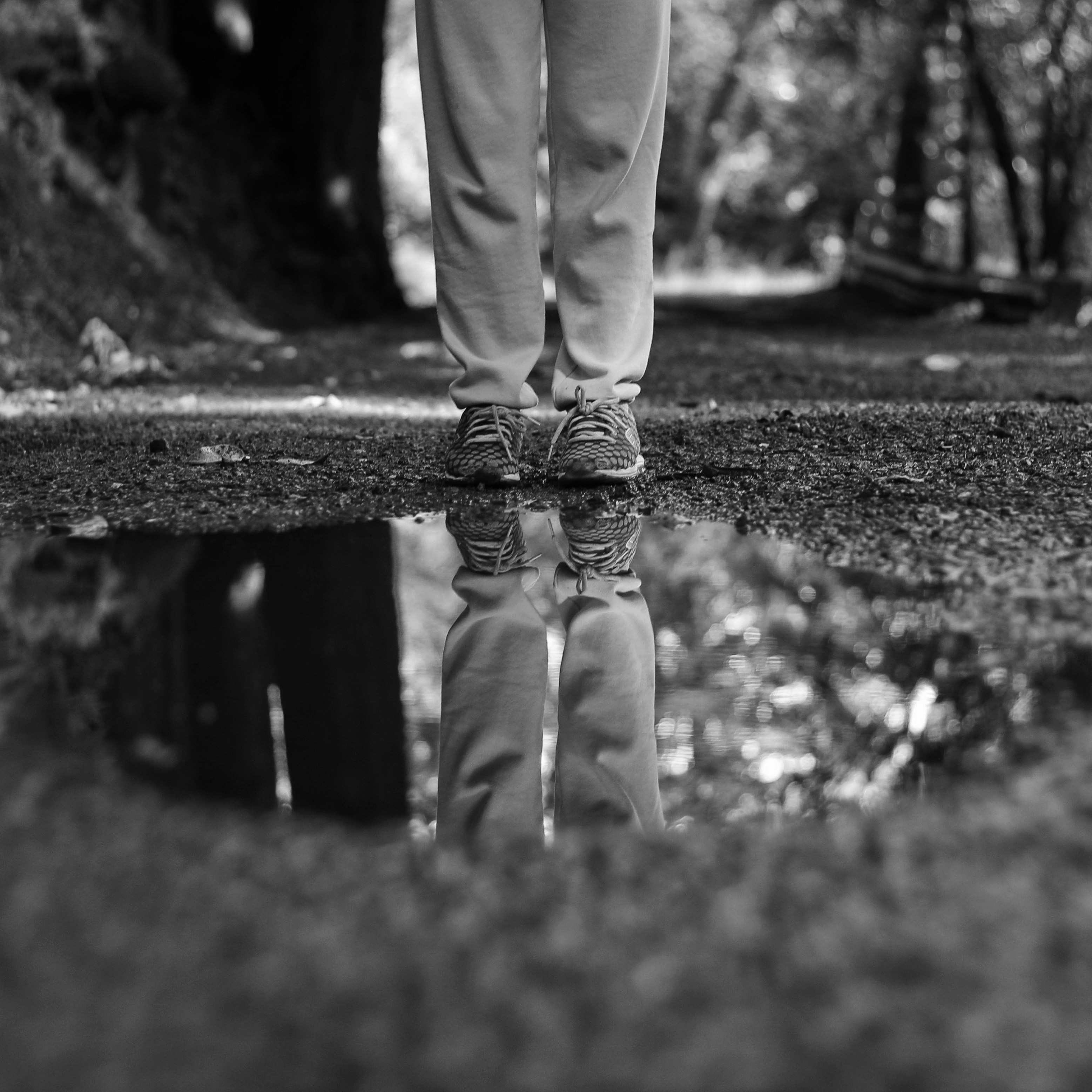 水坑,水,濕,反射,腿,腳,鞋,人行道,柏油路,黑和白,樹,林地,森林,游泳池,行人,小徑