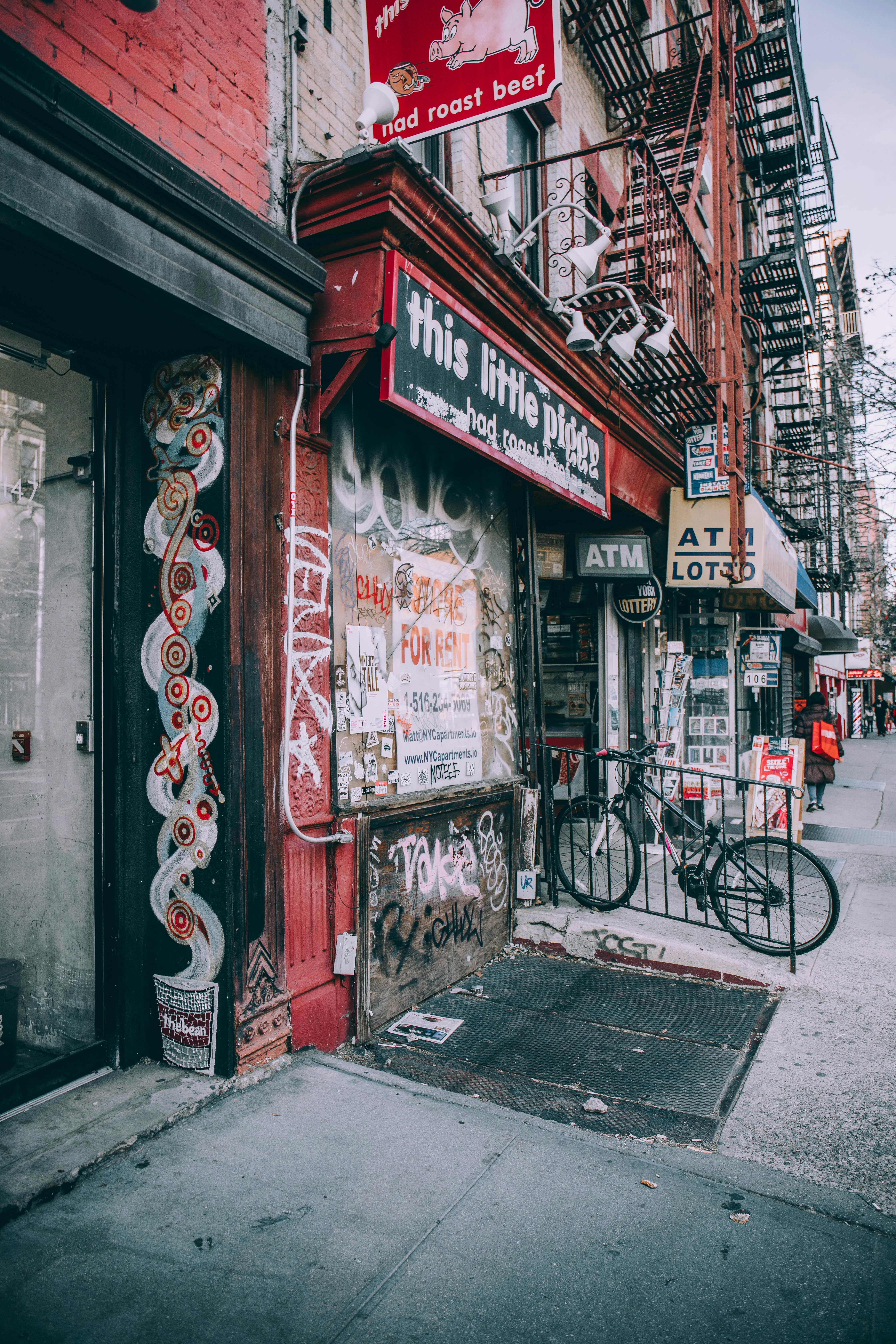 城市,城市,建筑,建筑,商店,紅色,標志,舊,失修,自行車,自行車,籬笆,人行道,URBEX,紐約,紐約,街道