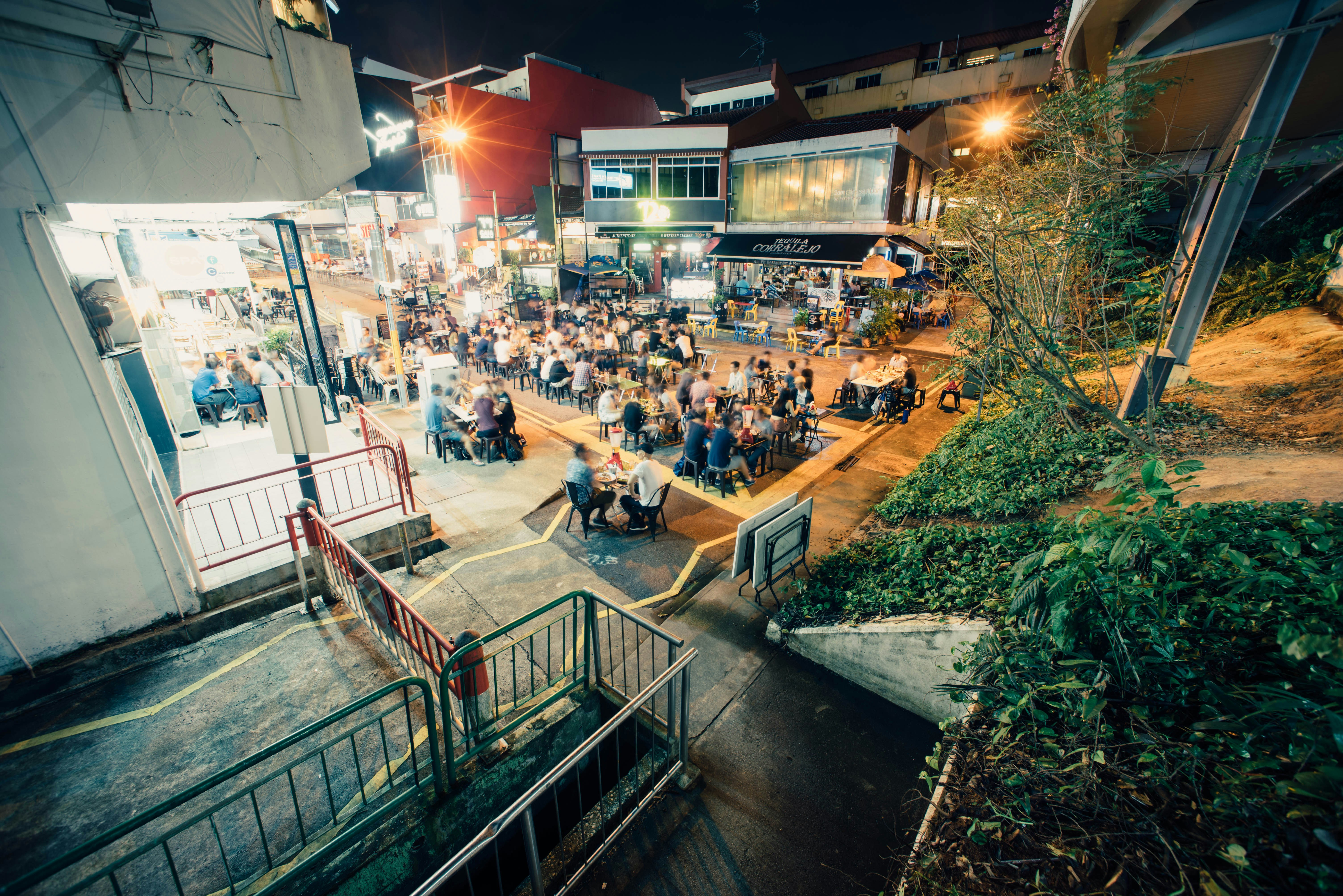城市、城市、建筑、建筑、傘、雨、雨、樹、街道、道路、輪子箱、商店、人群、單色、街道照片、圖案、線、人、亞洲、新加坡