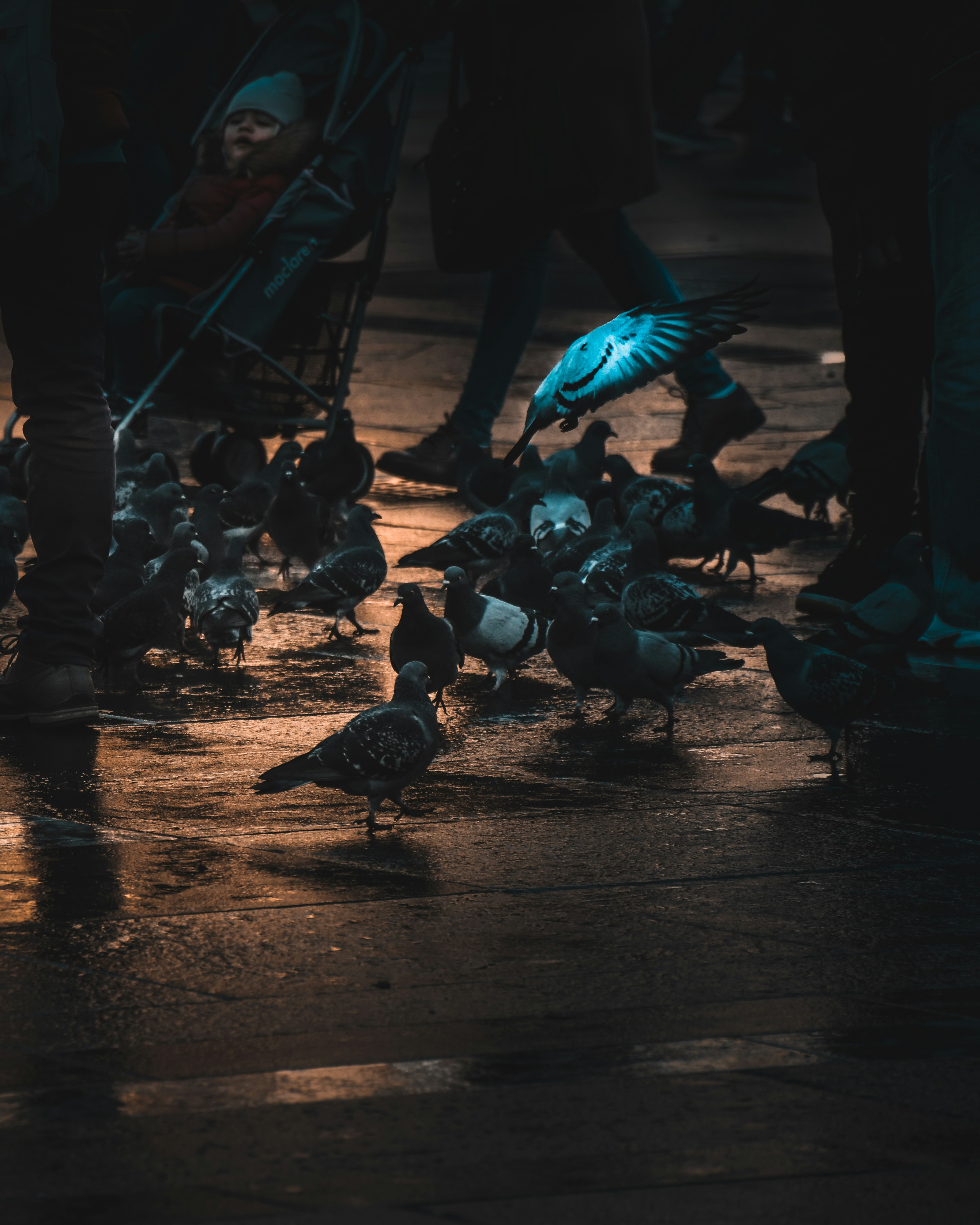 鳥,鴿子,街道,城市,人行道,濕漉漉,嬰兒車,椅子,羽毛,雨天,水,喜怒無常,心情,翅膀,飛行,飛行,地板