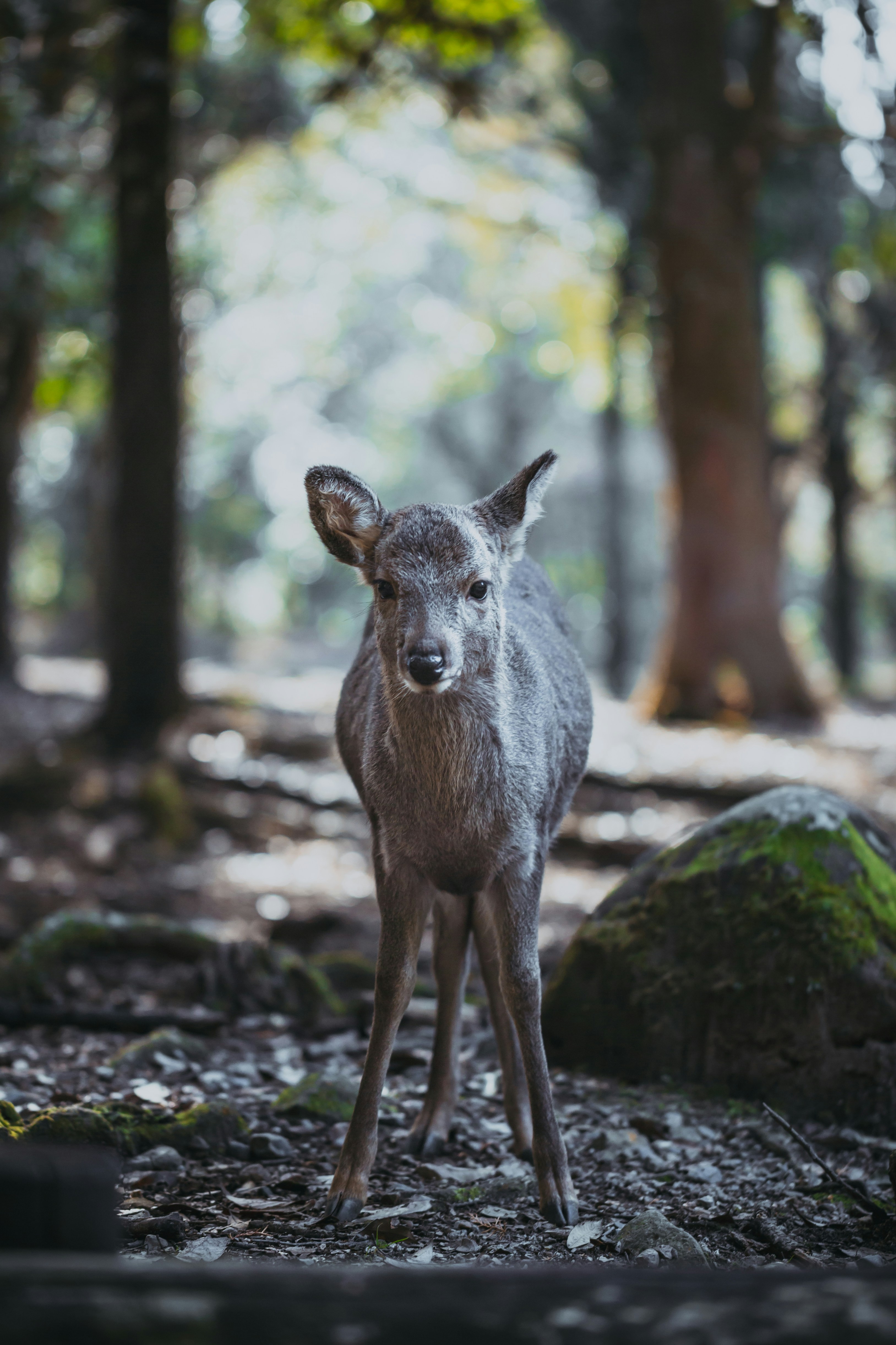鹿、動物、野生、樹木、林地、森林、巖石、自然、可愛、日本、納拉、宏、野生動物