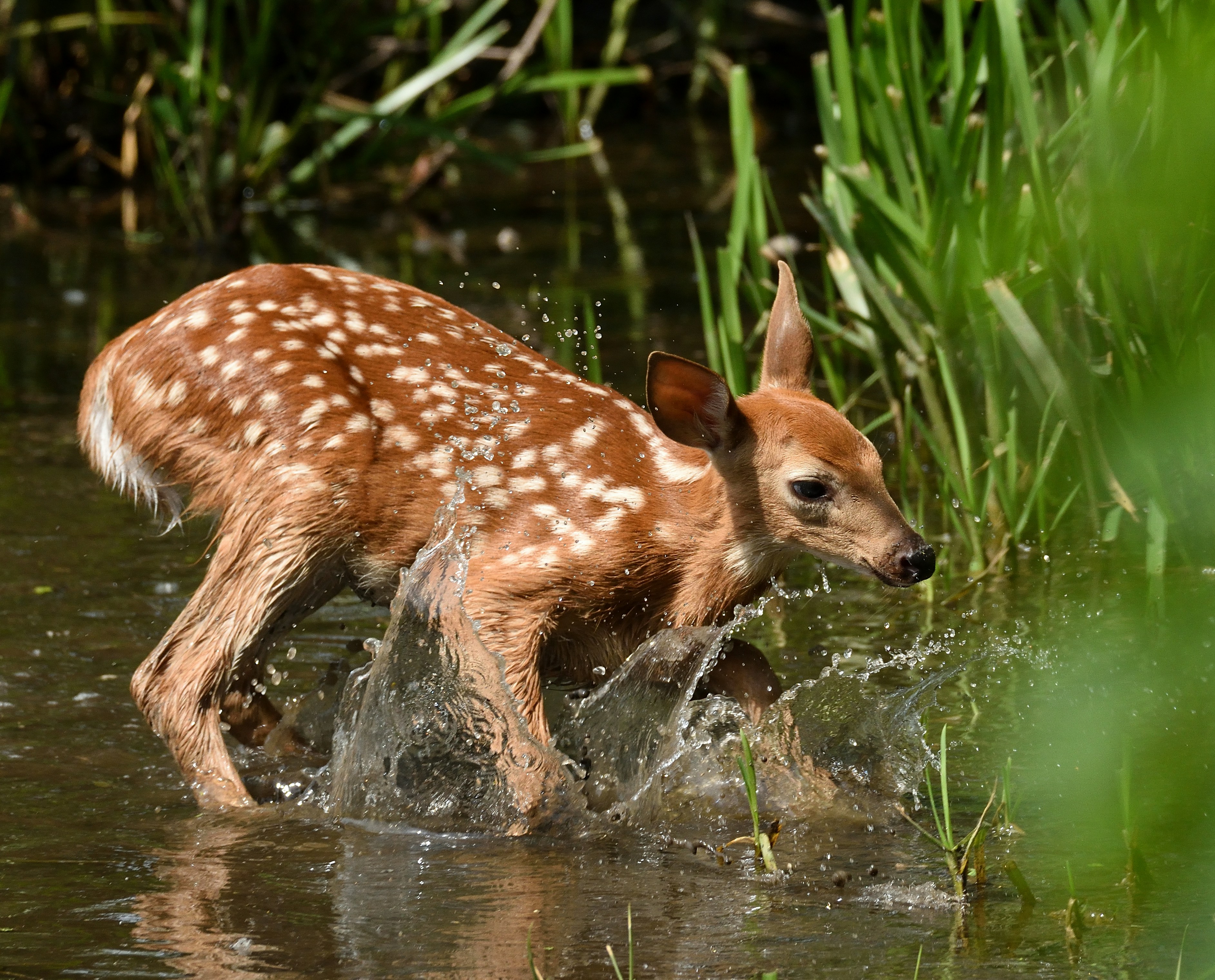 鹿,小鹿,動(dòng)物,溪流,飛濺,水,大自然,野生動(dòng)物,可愛(ài)的,小的,斑點(diǎn)的,棕色的,潮濕的,明亮的