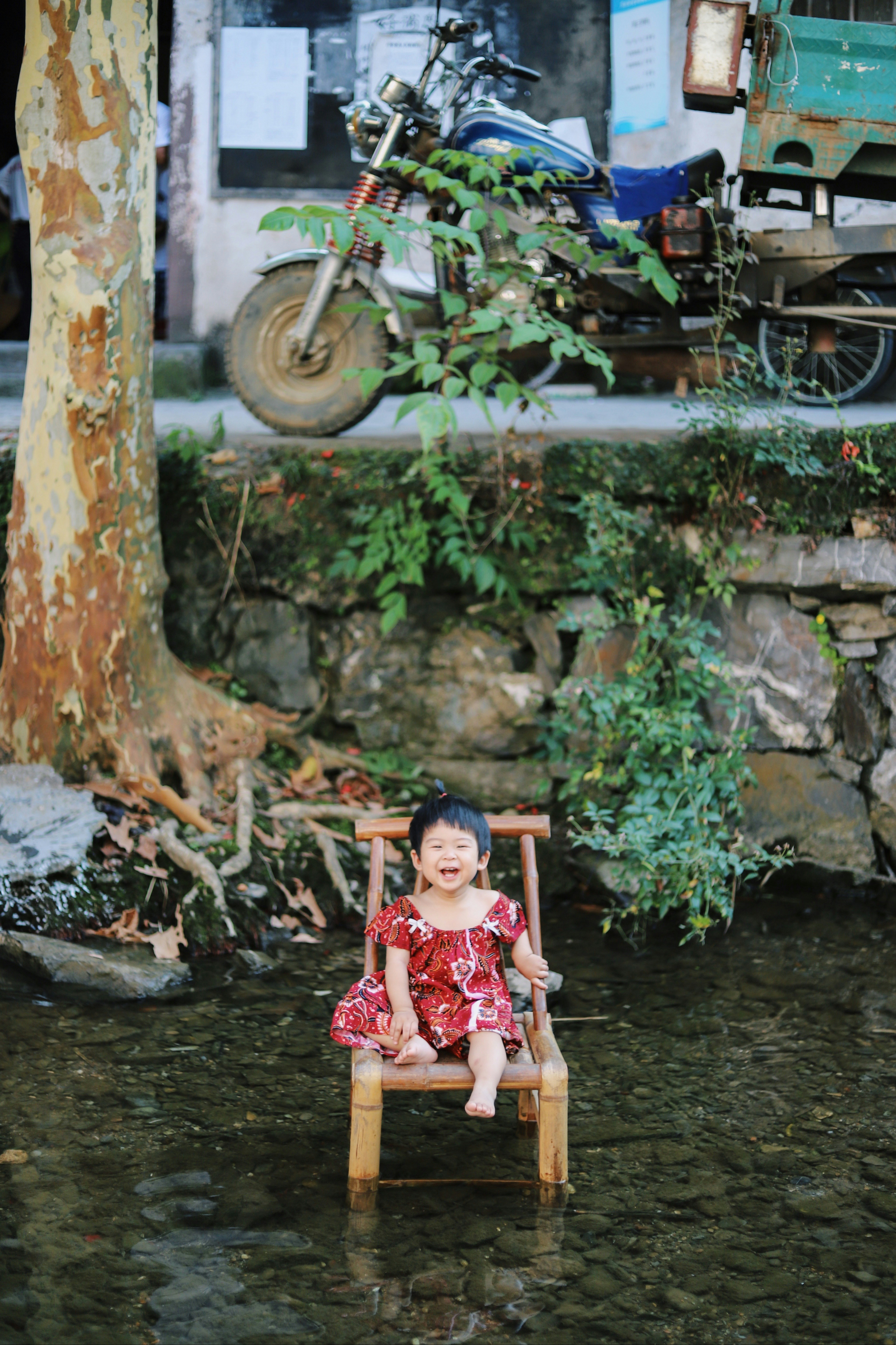 孩子,蹣跚學(xué)步的孩子,大河,大便,中國(guó)女孩,微笑,大笑,大笑,摩托車(chē),摩托車(chē)手,摩托車(chē),河邊,玩耍