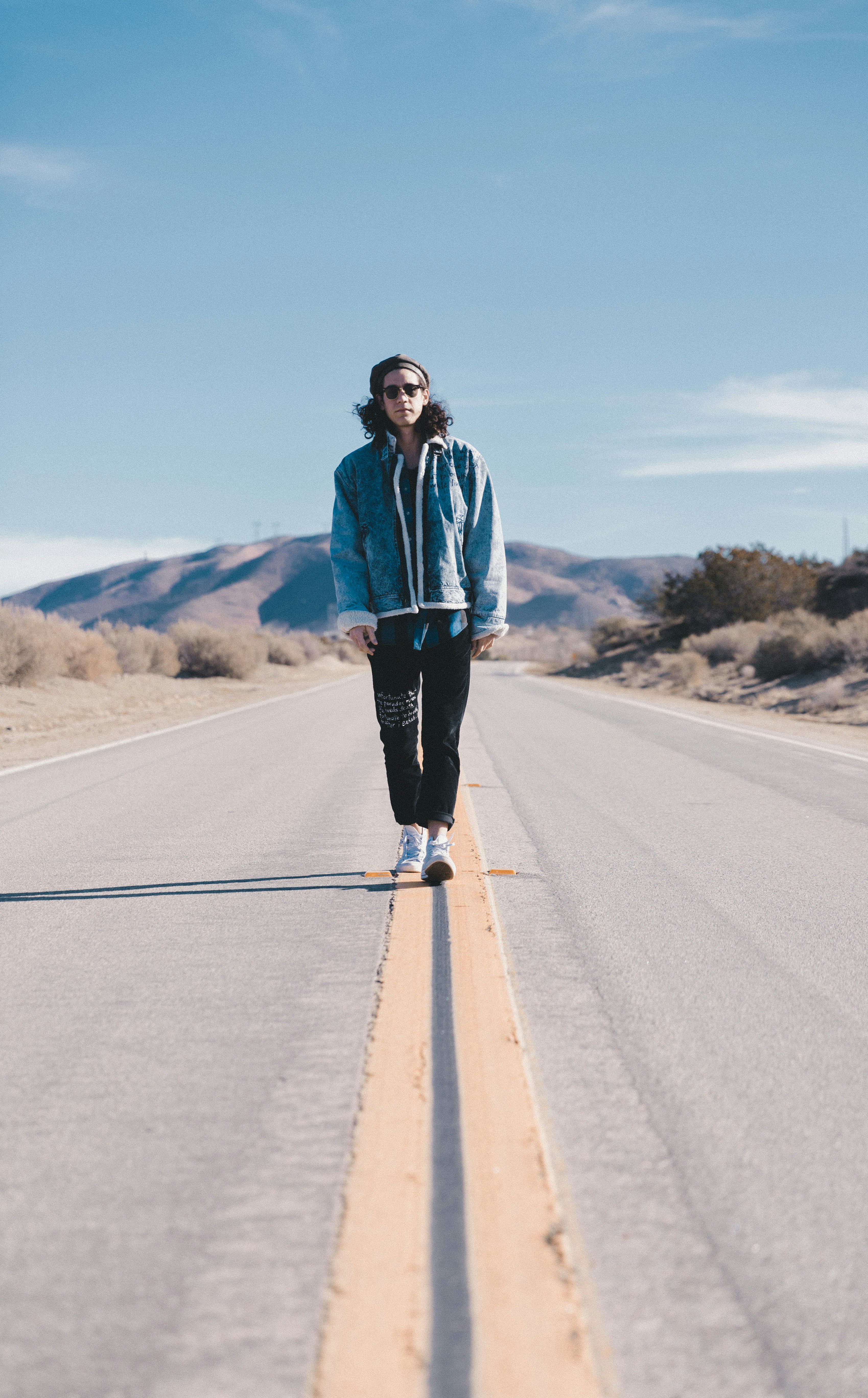 一個(gè)人站在一條有兩條線的道路中間。