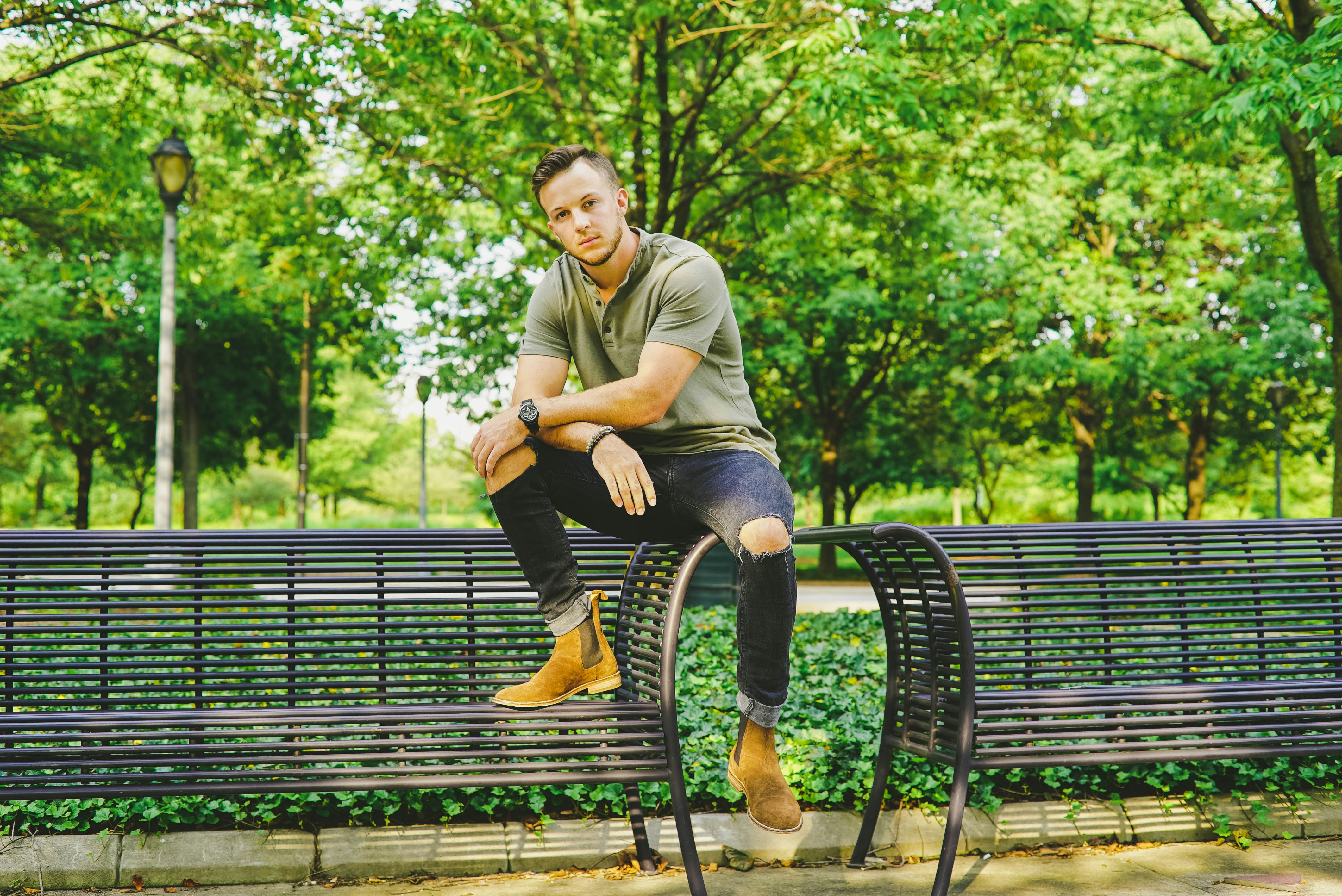 穿著牛仔褲的年輕人坐在空公園的長(zhǎng)椅上