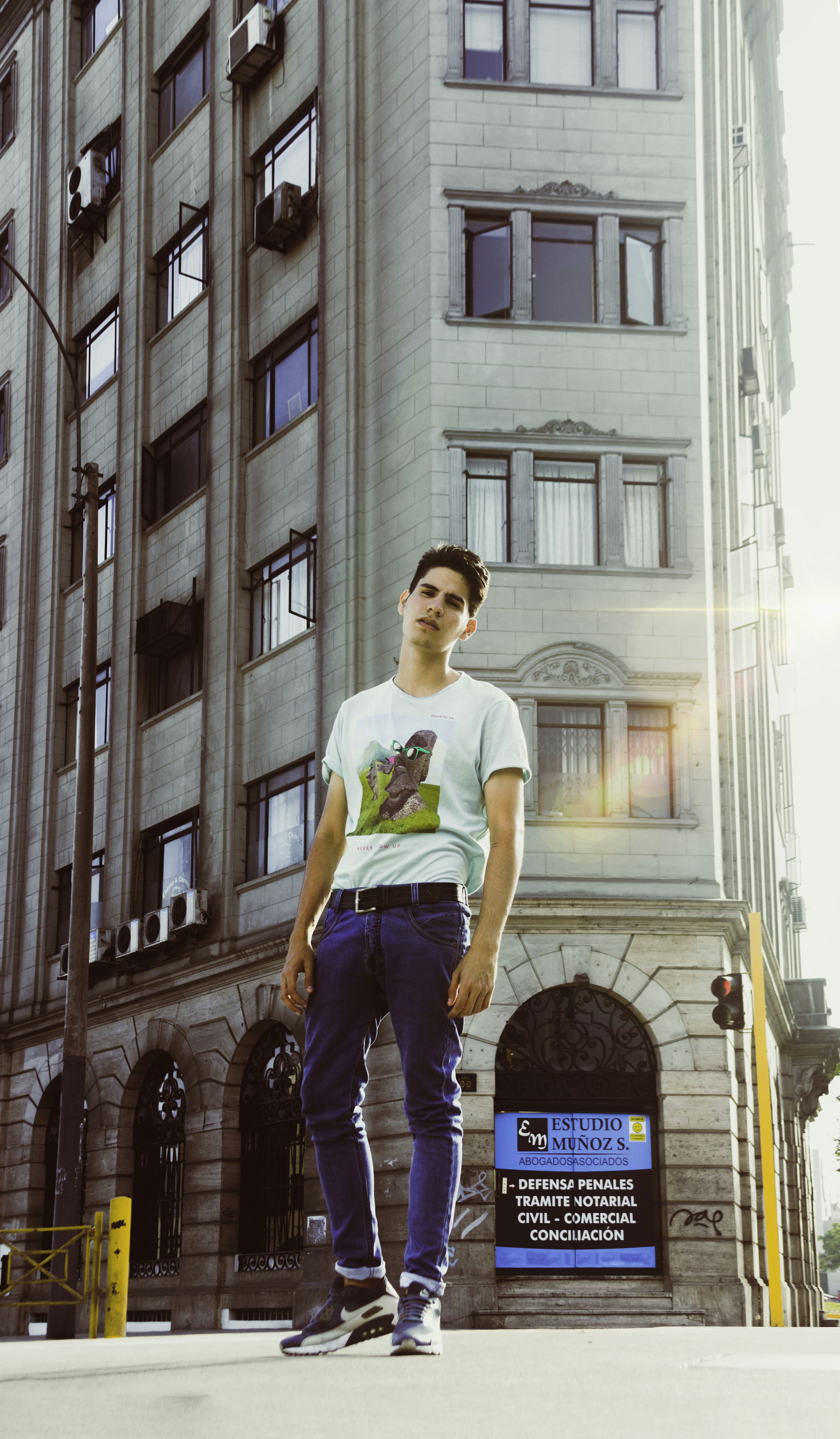 肖像,男性,男人,建筑,城市,耀斑,T恤,牛仔褲,陽(yáng)光,風(fēng)格90,城市照片,照片,攝影,城市,風(fēng)格,MODA,時(shí)尚