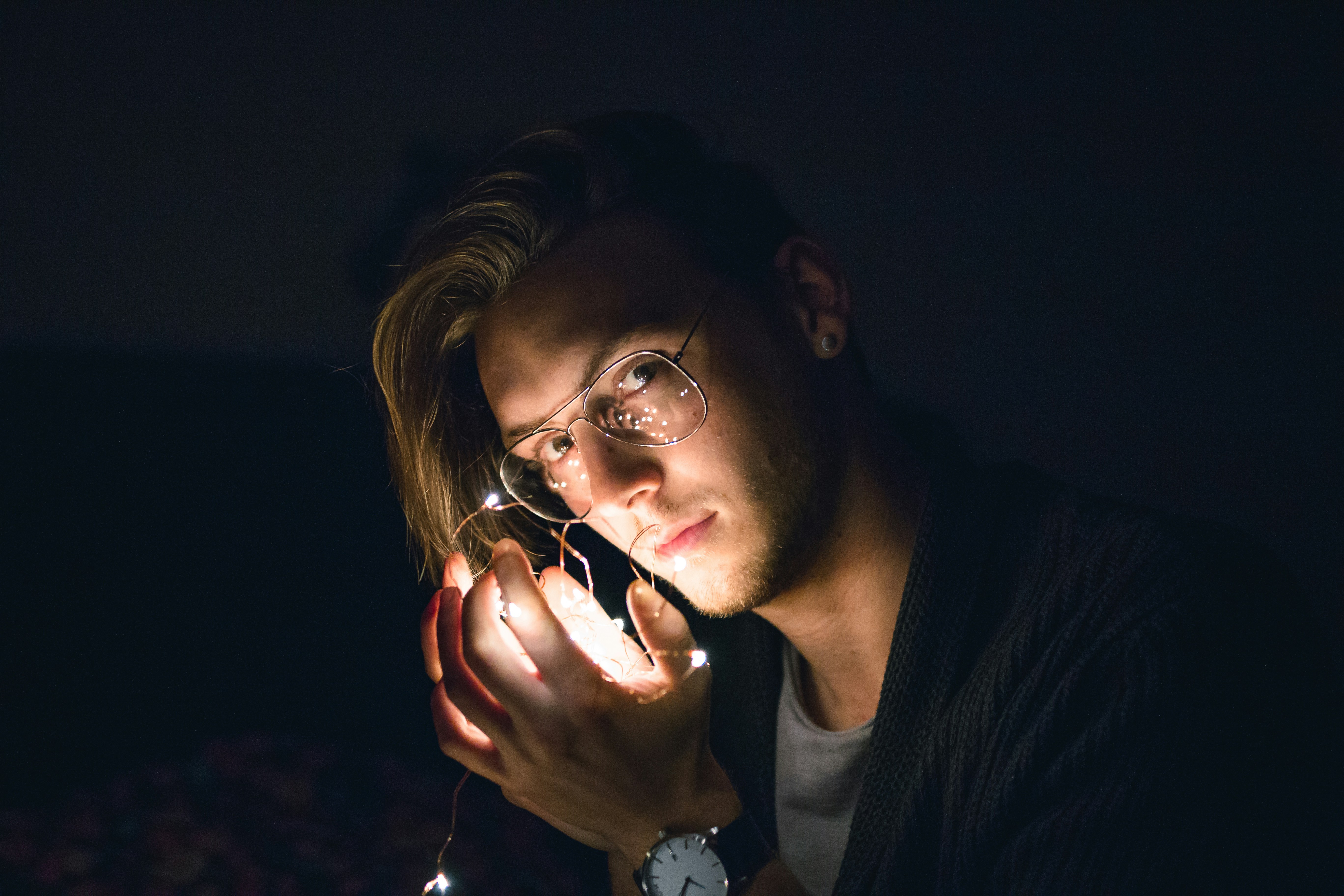 男,男,燈,仙燈,照,臉,眼鏡,手表,畫像,模特,長毛,開衫,眼睛,光,玻璃,反射